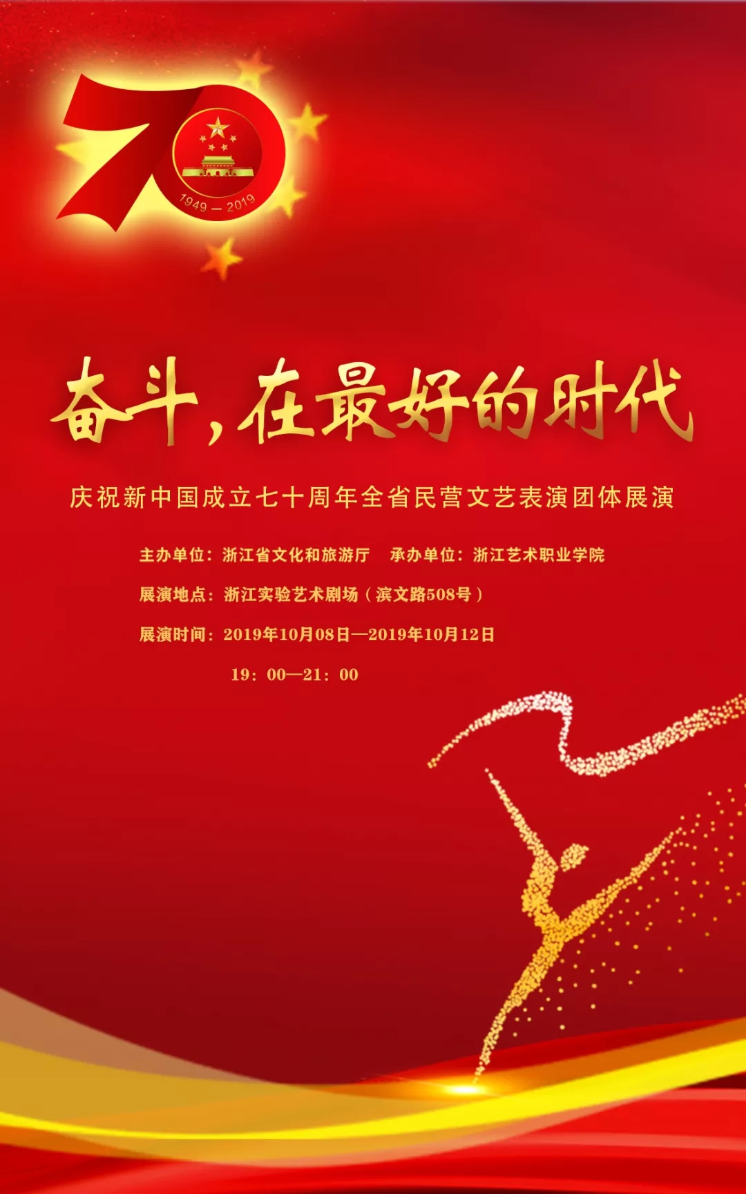 由浙江省文化和旅游厅主办、浙江艺术职业学院承办的庆祝中华人民共和国成立70周年全省民营文艺表演团体展演将于10月8日在浙江实验艺术剧场开幕。经过评选,有各市文化广电旅游局推荐选送的37家民营艺术表演团体参加展演,剧种多样,内容丰富。