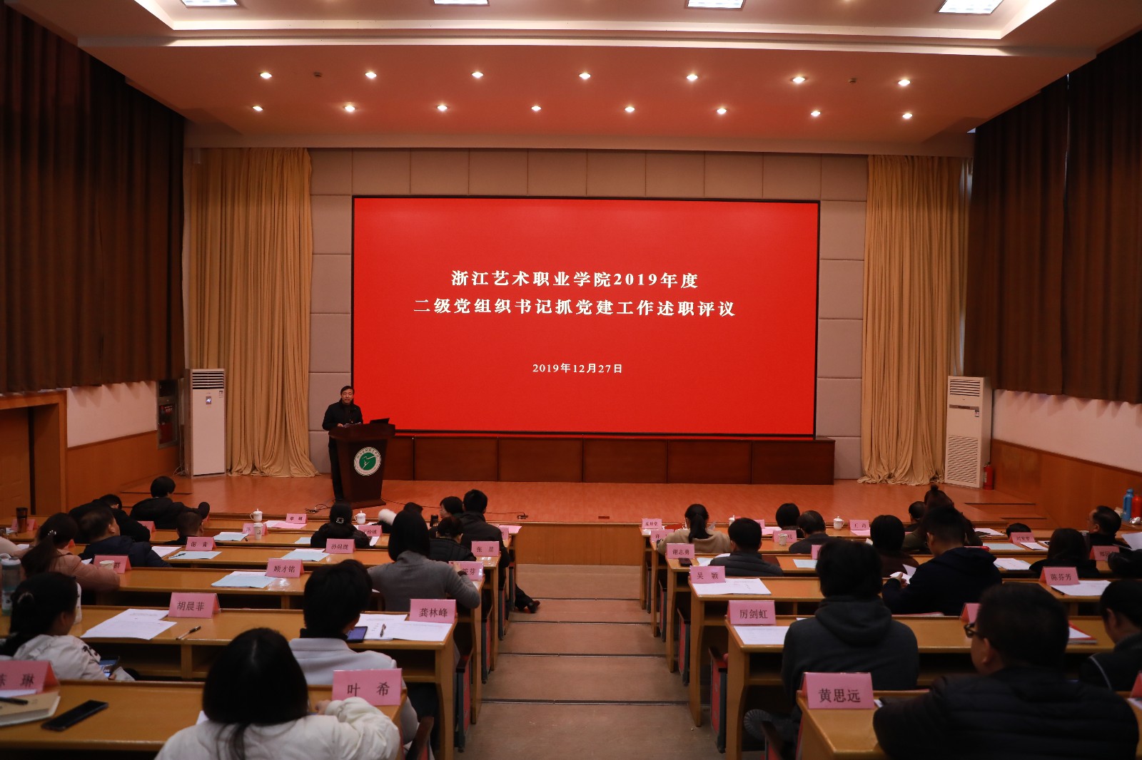 12月27日下午,浙江艺术职业学院2019年度二级党组织书记抓党建工作述职评议会在学校图信报告厅举行。校党委书记朱海闵,院长、党委副书记黄杭娟等在家的党委班子成员出席,相关职能部门和教学单位党政负责人、各基层党支部书记代表和教师代表等70余人参加述职评议会议。全校12个二级党组织书记围绕“履行抓党建工作第一责任人职责情况、开展“不忘初心、牢记使命”主题教育及其他党建工作重点任务完成情况、党建工作基础建设情况、引领推动本单位事业发展情况和对党建工作的分析和思考”等五个方面撰写了书面述职材料。6个教学系党总支主要负责人逐一进行了现场述职,6个二级党组织进行书面述职。与会人员综合平时了解的情况、现场述职情况对各二级党组织书记抓党建工作情况等进行了评议。述职评议由校党委副书记夏开堂主持。党委书记朱海闵对述职进行集中点评并作总结讲话。