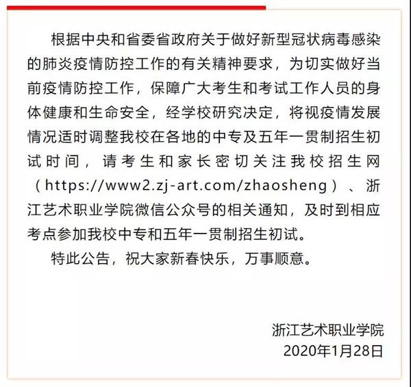 浙江艺术职业学院关于推迟中专及五年一贯制招生初试时间的公告