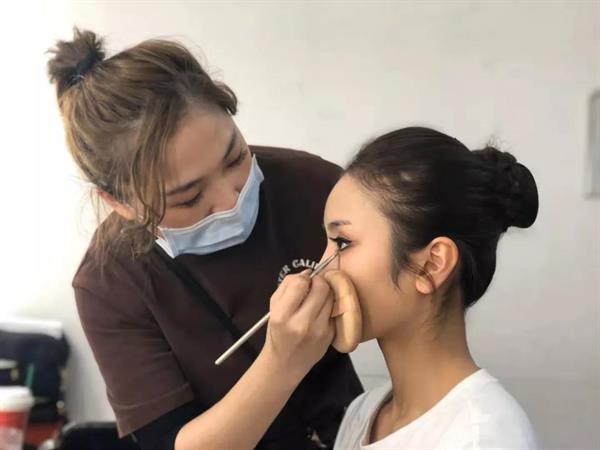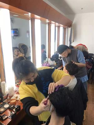 本次化妆和服装道具人员也一刻没闲着,13号就和演员一同去了杭州剧院,为演员彩排化妆,一直到剧院关门。演出当天早上8点半就出发,中午1点开始化妆,直到6点完成220多个演员的化妆,最后手都软了。在演出过程中,由于很多演员在多个节目有表演,所以后台一直处于抢妆状态,换相应的发饰和服装,等演完,大家才松了口气。