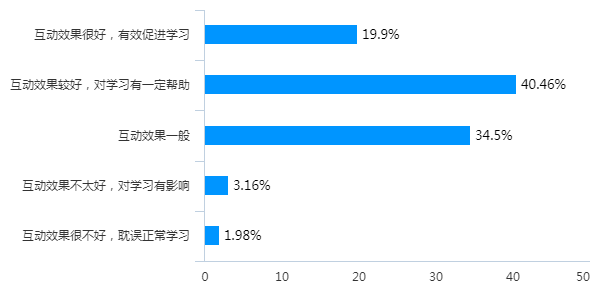 认为互动效果很好或较好的学生占60.36%,一般、不太好和很不好占39.64%;认为老师指导答疑很好的占64.08%,一般、较差和很差占35.92%。可见线上教学的指导、互动还应加强。