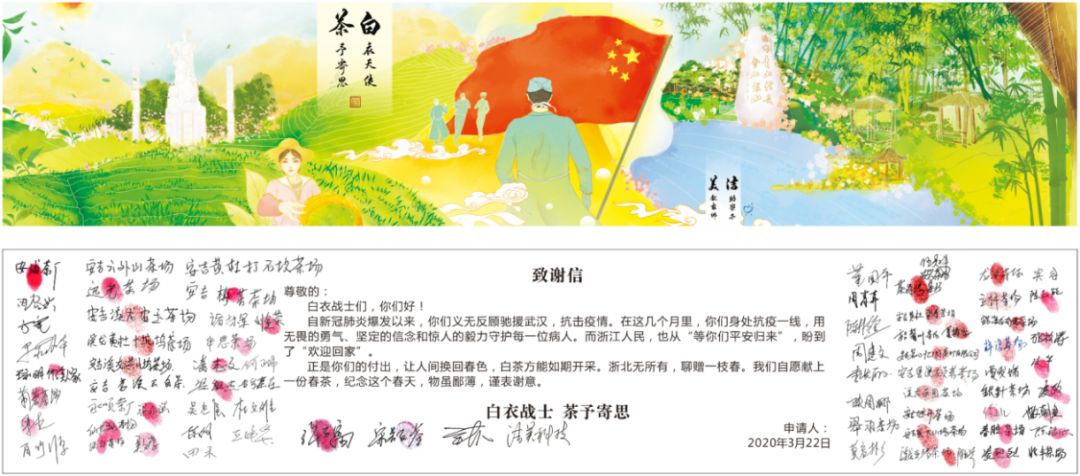 正如倡议书所提到的,茶不在多,有心则足。汇星火之力,敬一腔热血。收到茶后,项目组精心设计手绘了特别的腰封,正面是安吉的茶山和竹林,正中是国旗下,医护人员的身影。管涵婧介绍,腰封的背面设计受医护人员请战书启发,做了各个捐茶人签名的致谢信。整个伴手礼就是为医务人员定制的一款独特产品。“活动进展得很顺利,感谢学校的老师,许多方面都有用到我在浙艺学到的知识。在2020这一不平凡的年度里,平凡的我们都在竭力做一点事回报社会。”
