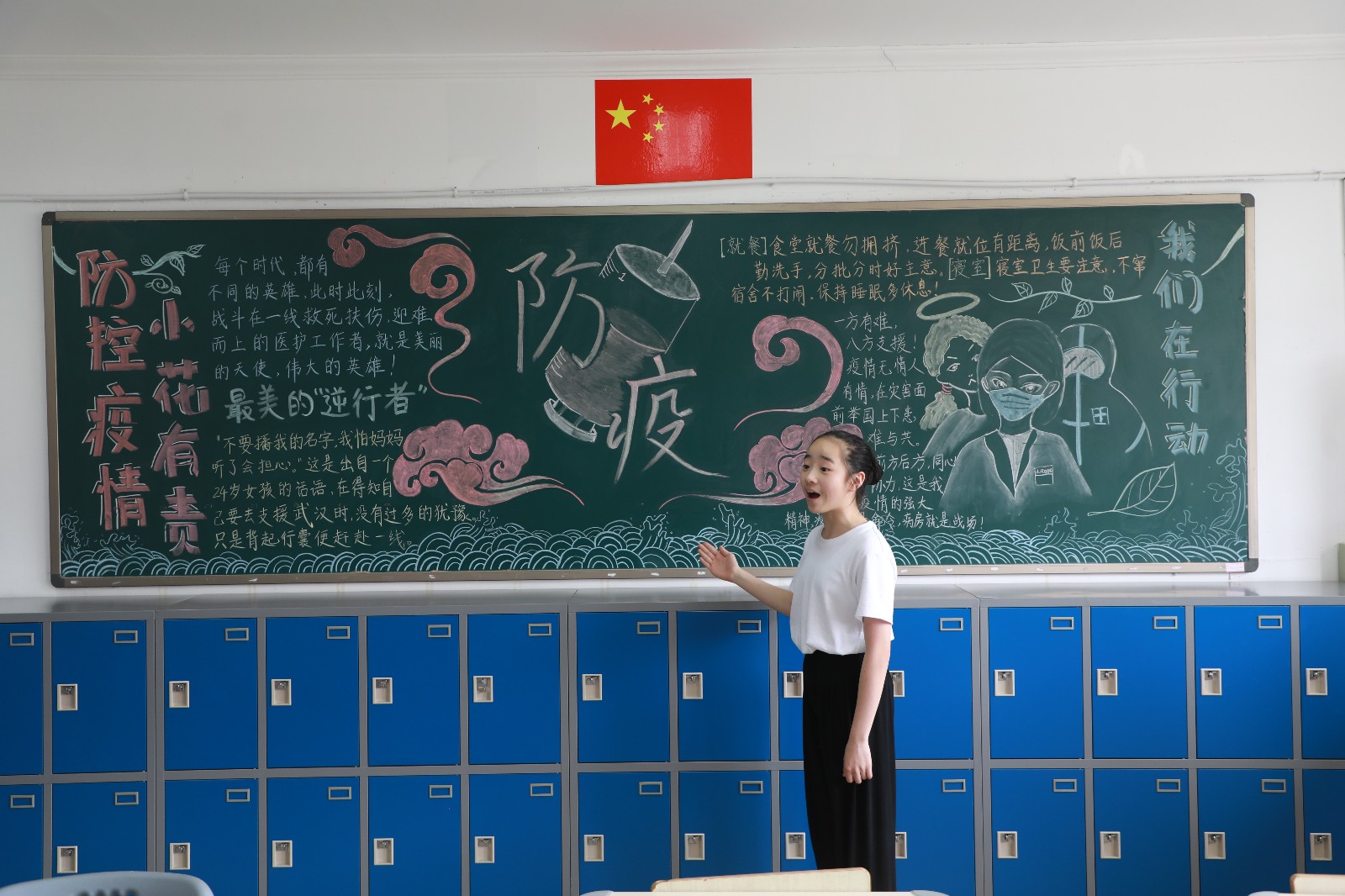 各班级结合疫情,以图文并茂的形式展现最美逆行者抗击疫情的先进事迹,内容丰富,板书书写工整,绘画生动形象。有黑板报分成感党恩、战疫情、续辉煌三部分,表达了同学们只争朝夕、不负韶华、走出精彩、成就辉煌的决心。有用祥云等代表性造型表达了作为龙的传人,防控疫情,人人有责。也有的班级以身披国旗的最美逆行者形象展开,画了武汉黄鹤楼相呼应,板报底部还画了戏曲人物像,表达了作为戏曲人以艺抗疫的担当。同学们设计的板报中,有的内容介绍了防疫妙招、洗手七步法则、心理疏导的途径和联系方式,也有介绍了抗疫中的先进典型人物和感人事迹,还有展现学生在家上网课和复课后教师的教学风采。