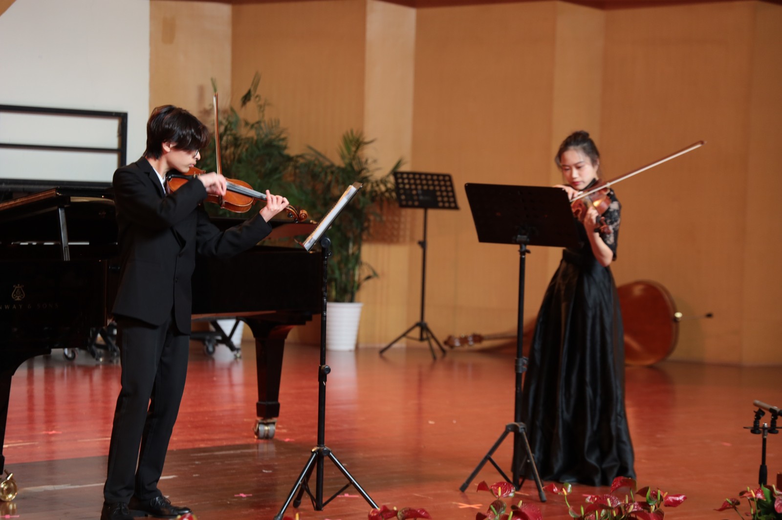 钢琴与小提琴合奏曲《组曲为两把小提琴与钢琴而作》演奏中,两位小提琴手与钢琴手的默契配合,使两种琴音融洽地交织在一起,让听众们深刻地感受到莫什科夫斯基风格的异国情调。