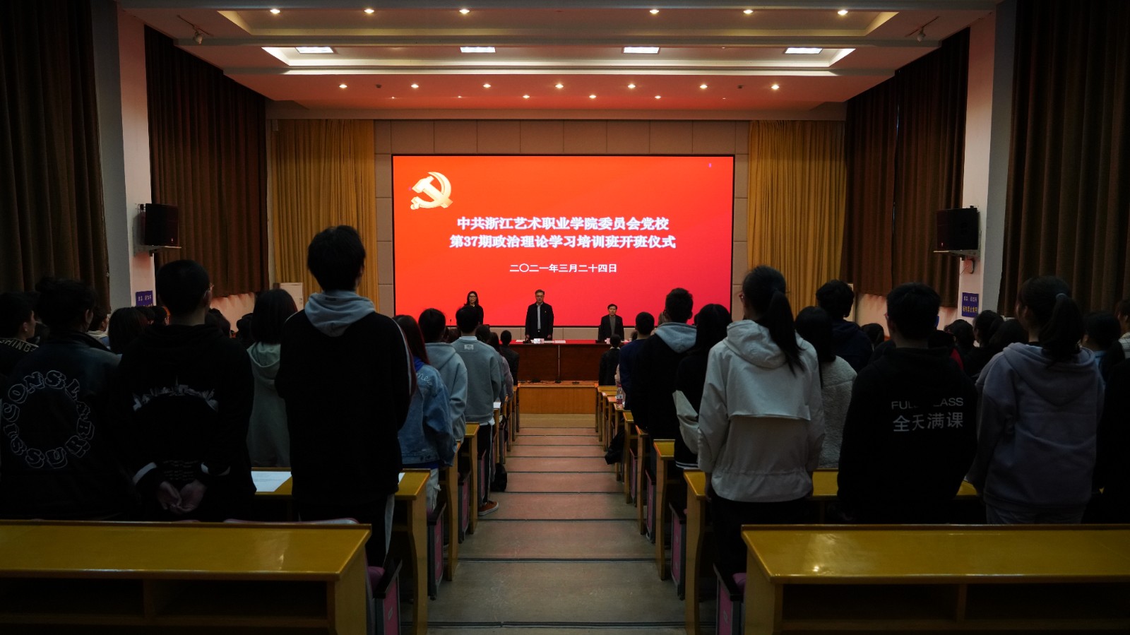 3月24日浙江艺术职业学院党校第37期政治理论学习培训班班仪式图信中心报告厅举行。校党委书记、党校校长薛亮出席讲话。校党委委员、宣传部部长、党校副校长马向东主持开班仪式党校校务委员、党校班主任和157名学员参加开班仪式