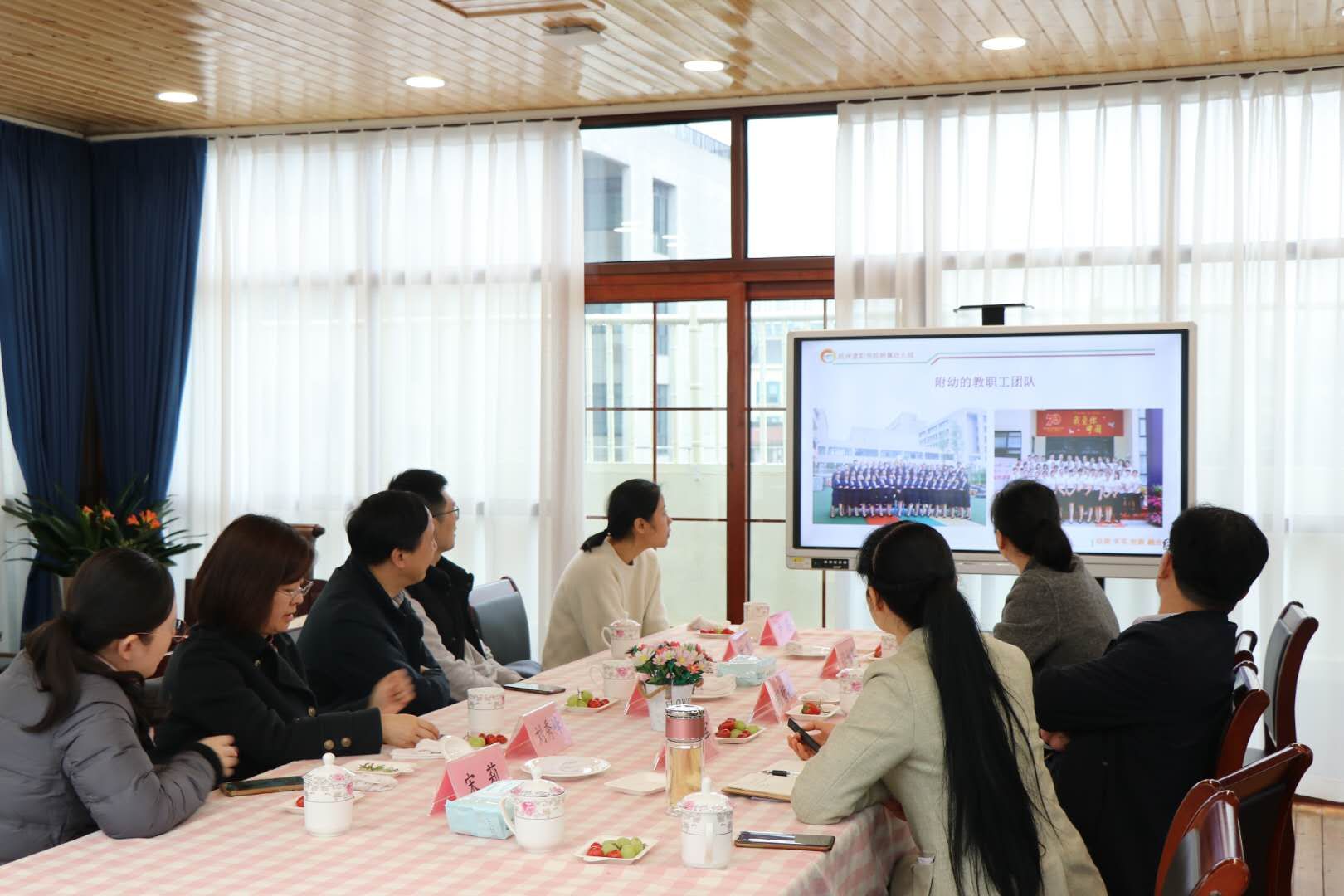 富阳学院党委书记彭哲敏、副院长张利琴、学前教育和护理专业部部长宋祖明接待了考察团,彭哲敏介绍了富阳学院学前教育专业的办学历程及成果。