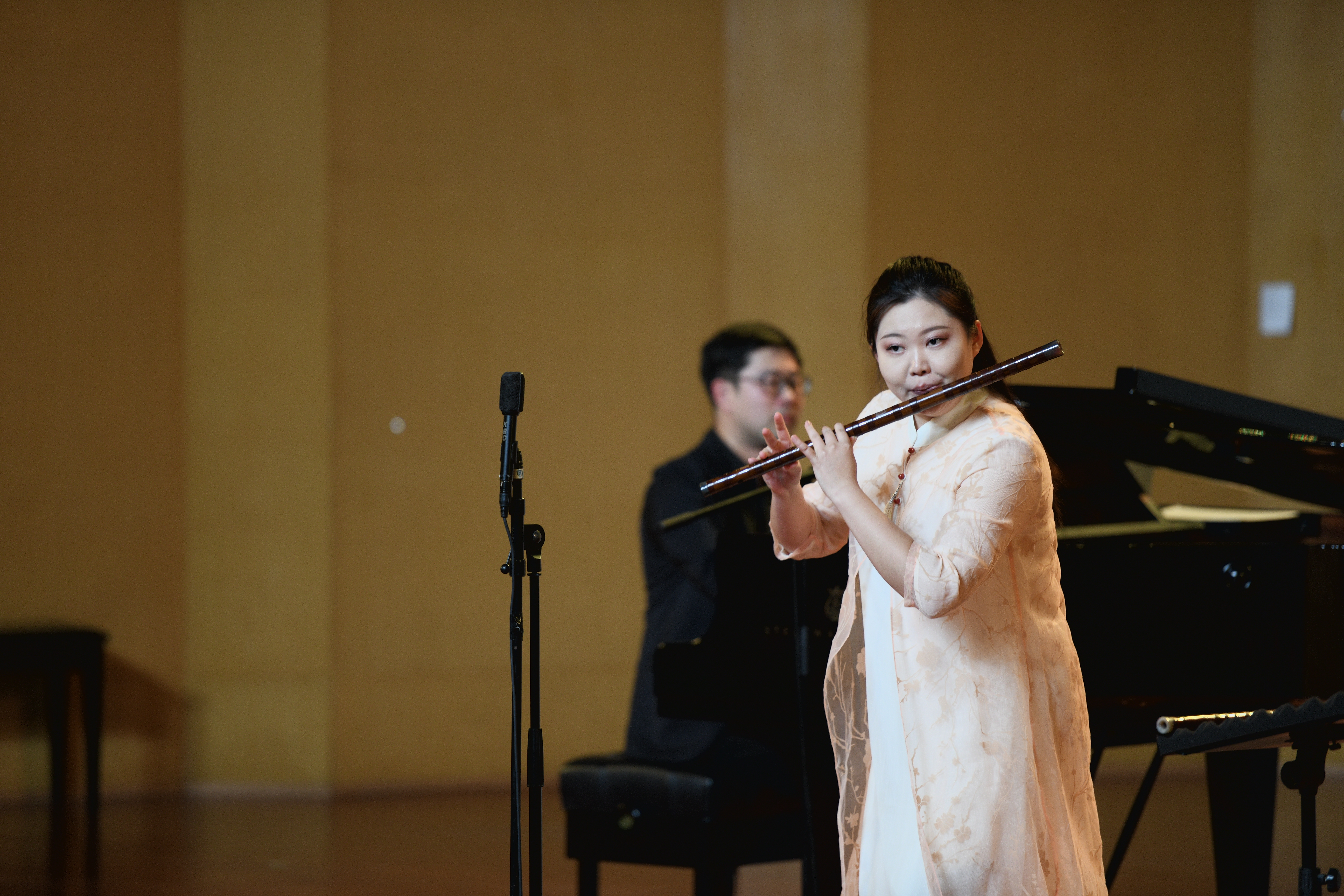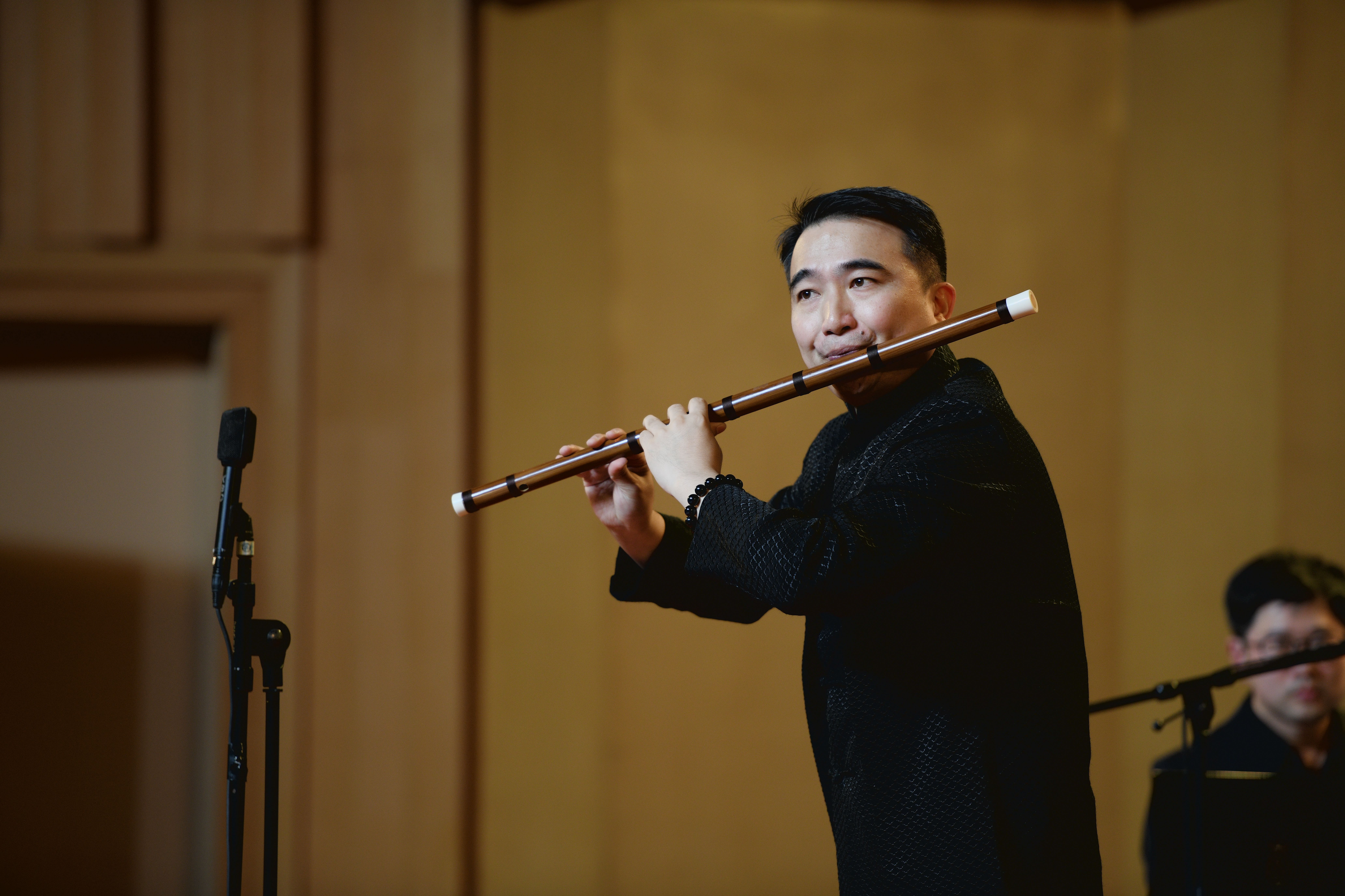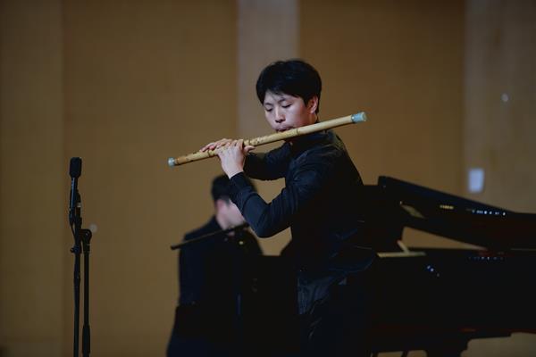 我校音乐系竹笛专业教师常轶伟带来了一首充满西域风情的《胡旋舞》。该曲由台湾作曲家钟耀光作曲,原是一首西洋长笛曲2010年经中央音乐学院博士生导师戴亚教授改编后作为当年台北笛子大赛决赛规定曲目,是目前笛曲中技术难度较大的作品。作为浙艺音乐系民乐教研室青年教师代表的常轶伟,自2020年荣获“新松计划”浙江省青年演奏员大赛吹奏组一等奖后,此番再度亮相舞台,带来了精彩纷呈的出色演绎。