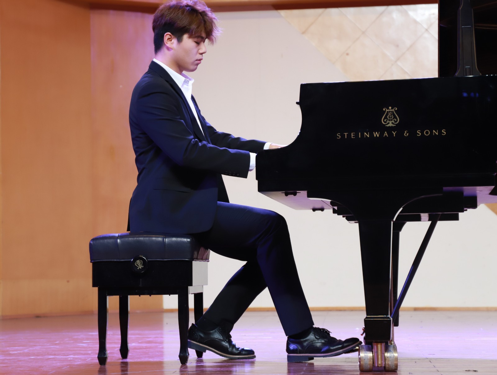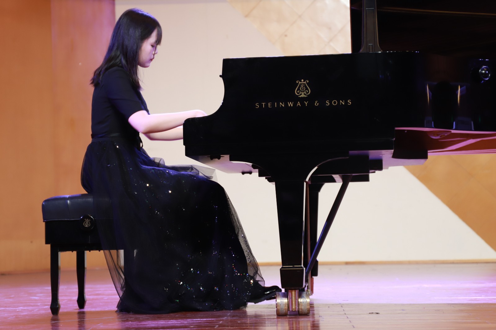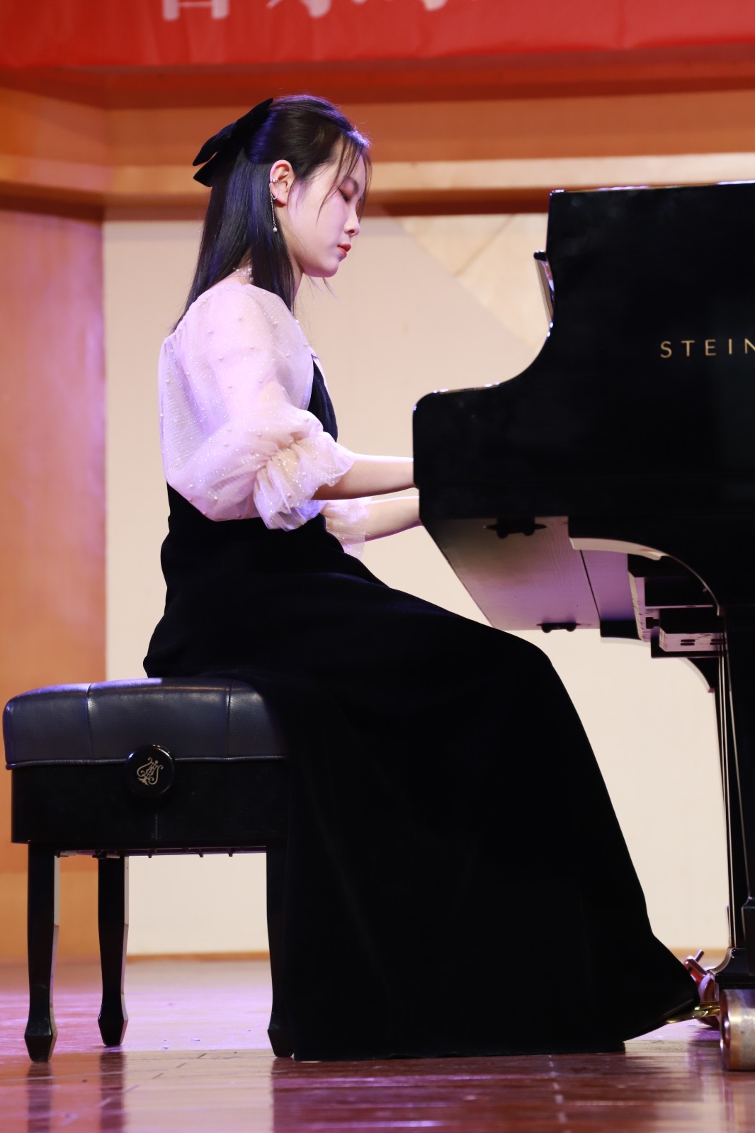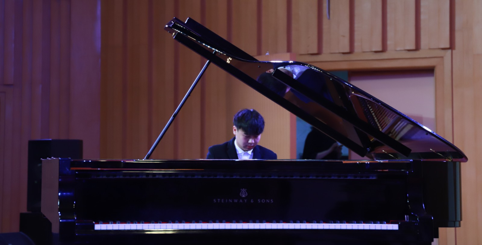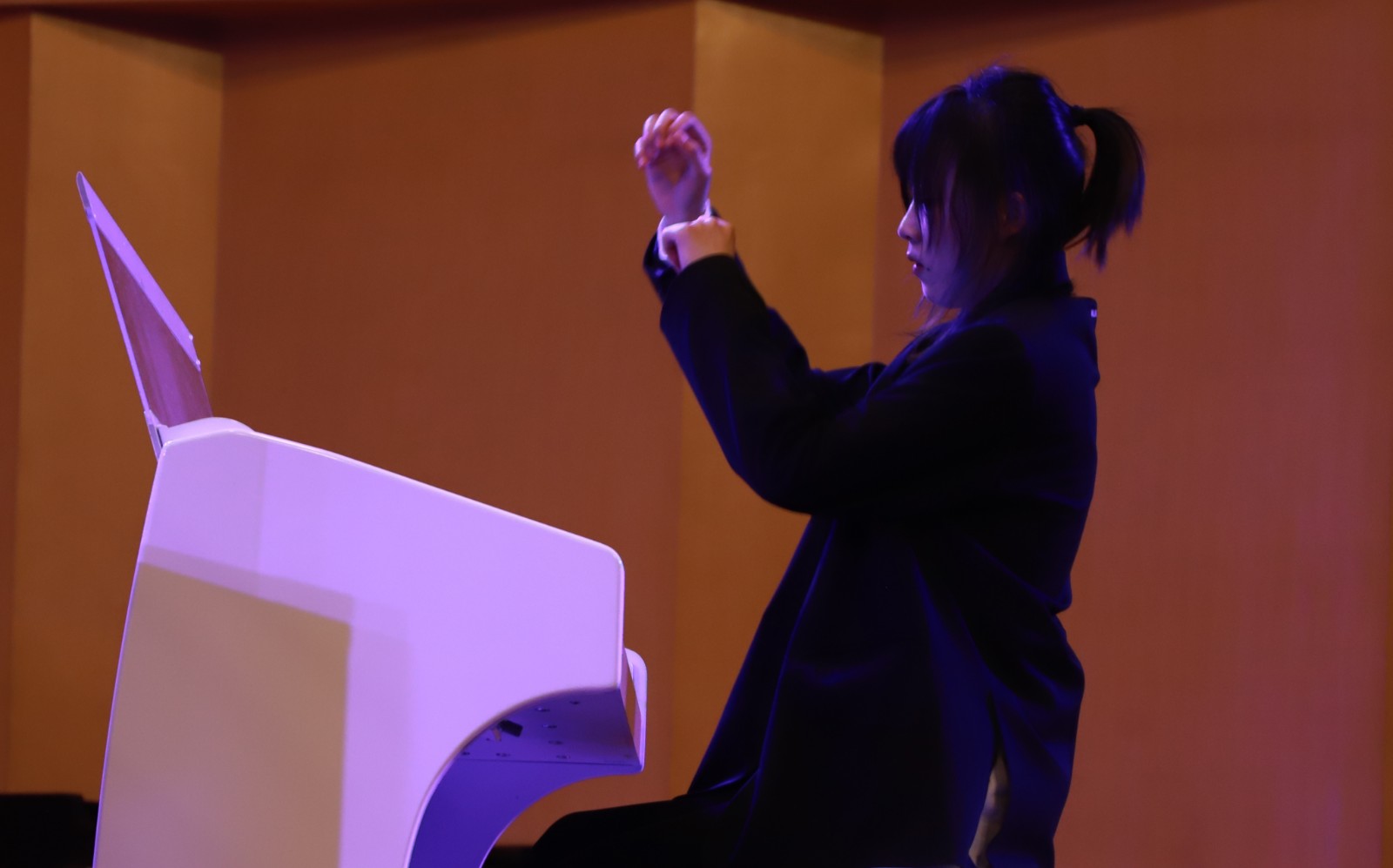 在蓝紫色的灯光下,陈姿羽用双排键电子琴给大家带来了一曲《伊戈尔王-鞑靼人之舞》,琴声时而热情洋溢,时而沉闷有力。陈星伊用一曲《敦煌随想》带听众们走进了浪漫而又神秘的敦煌。周玛莉将律动与和声进行了巧妙组合,一首《彩》让大家置身于绚烂多姿的光影幻境中。龚煜城技术娴熟,带来的《交响舞曲第三乐章》,节奏忽快忽慢,带给观众们别样的听觉感受。李诺舟准确的把握住了莫什科夫斯基《西班牙随想曲》中浓浓的西班牙式节奏感和特殊的和声走势。魏洲将普罗科菲耶夫《罗密欧与朱丽叶》的主题冲突把握的很有分寸,具有戏剧性效果。王子田的肖邦《平静的行板与大波兰》华丽而庄严,平静却不失张力。