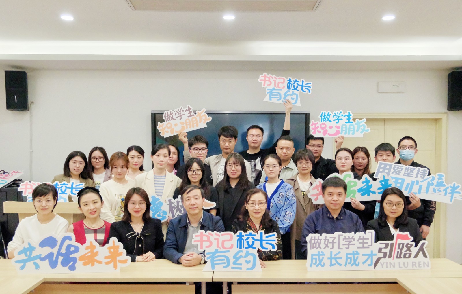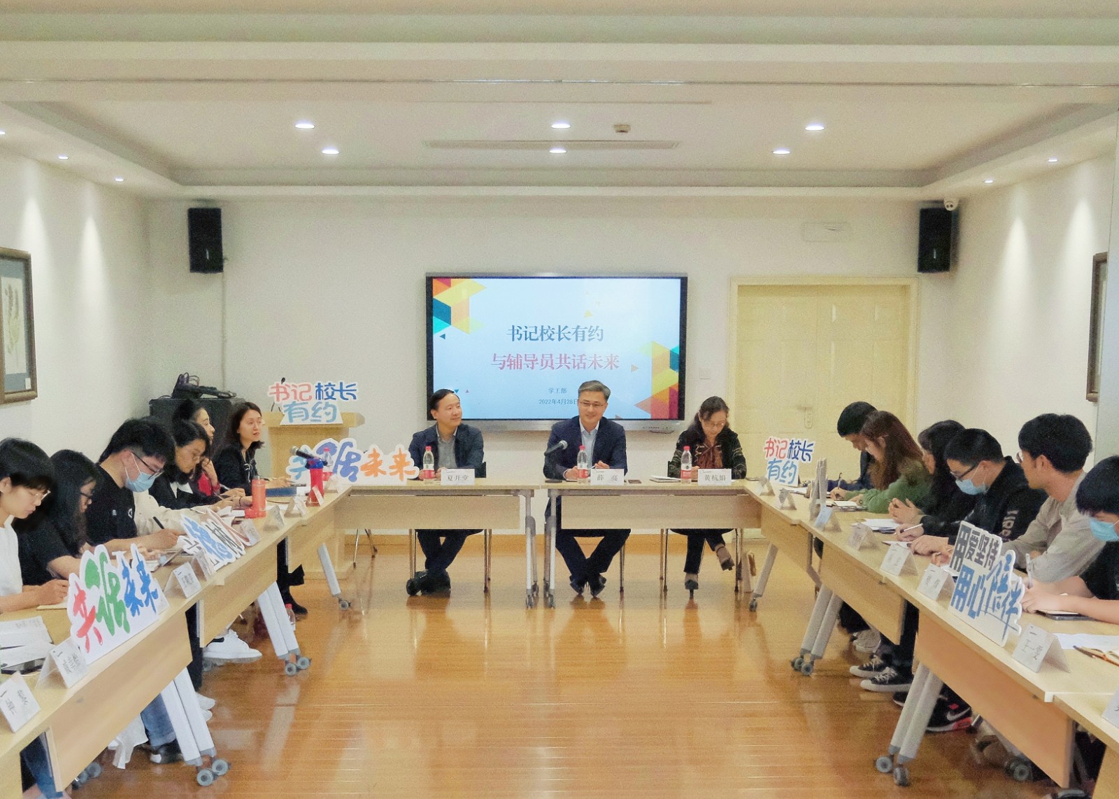 正值五四青年节到来之际,4月25日,习近平总书记来到中国人民大学考察调研,与师生代表座谈并发表重要讲话。为学习贯彻落实习近平总书记重要讲话精神,进一步关心加强我校青年思政工作队伍建设,切实提升辅导员工作能力水平,4月28日下午,“书记校长有约”第七期——辅导员工作座谈会在图信中心研讨室举行。校党委书记薛亮、校长黄杭娟、党委副书记夏开堂与全体辅导员亲切交流座谈,共话成长。各二级学院党组织学生工作负责人、学生工作部主要负责同志参加。