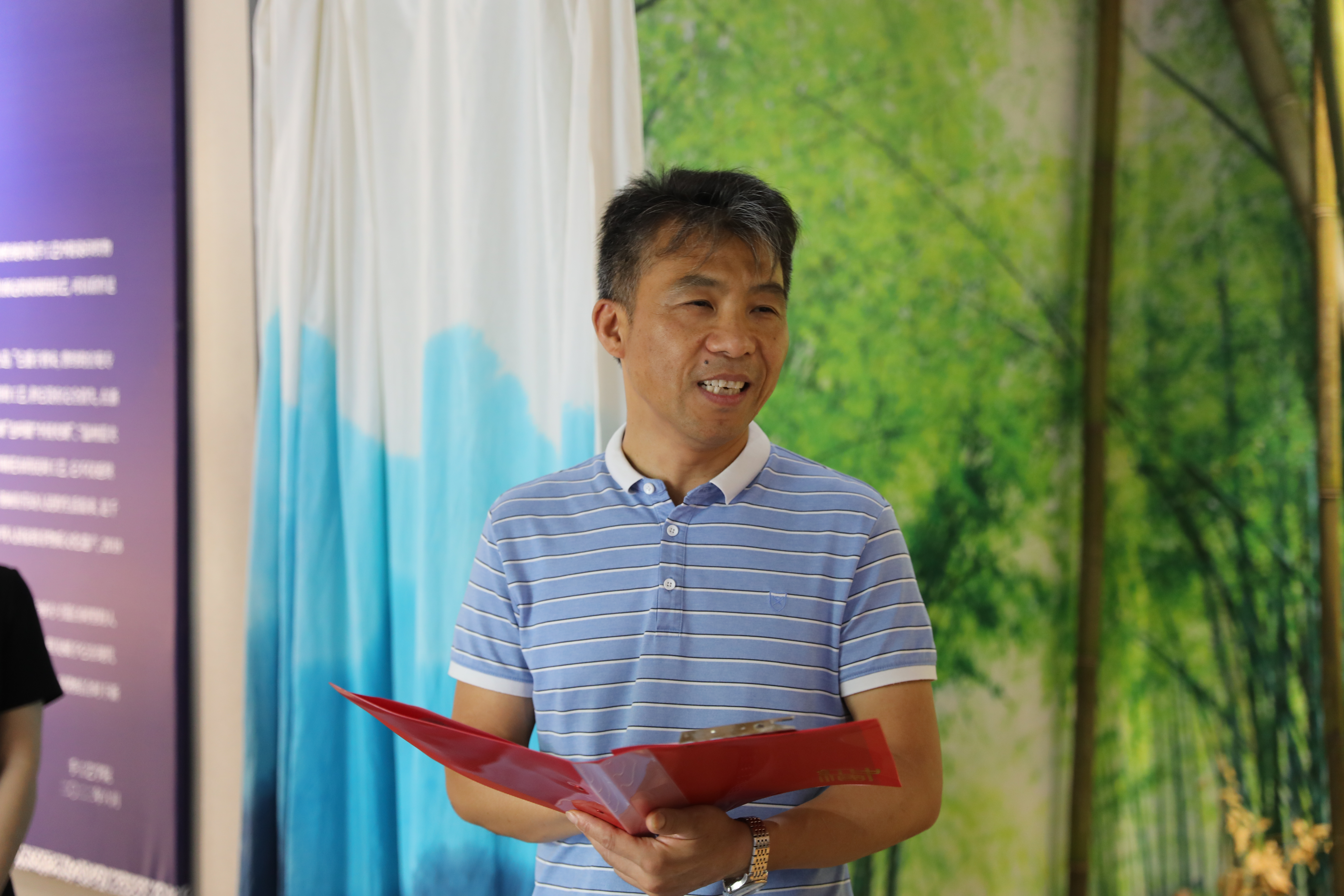 沈军甫致开幕词。他表示本次非遗夹缬文化创新艺术展是“艺海撷英”系列的第三场展览,展示了方寸蓝白间里的人文印记。通过传统夹缬技艺与新时代的巧妙融合展现非遗文化新魅力,是校企合作又一突破。双方合作搭建实践学习平台,进一步推进校行企协同联动,产学研培一体化建设,精准实现人才供需对接。通过产教融合,进行有效的资源整合,更好地助力“夹缬”技艺的匠心传承,推动现代职业教育培养更多优秀技能人才。