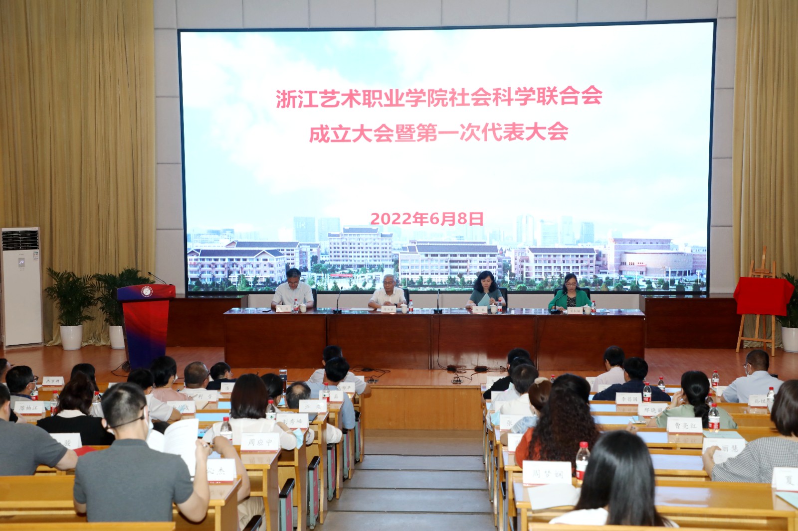 6月8日下午,浙江艺术职业学院社会科学联合会成立大会暨第一届代表大会在学校图信报告厅举行。浙江省社科联党组成员、副主席陈先春,浙江省文化和旅游厅科技与教育处处长郑妮,浙江艺术职业学院领导班子,有关部门负责人,社科联第一届代表以及学生代表参加了成立大会。会议由院长黄杭娟主持。