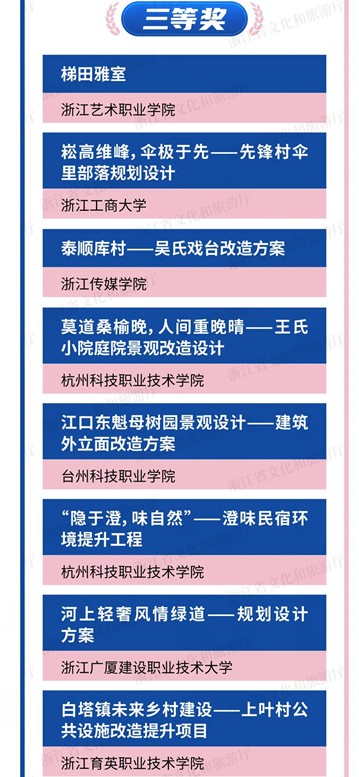 本次大赛是深入贯彻浙江省旅游业“微改造、精提升”五年行动计划的生动实践,让高校师生成为助力浙江旅游业高质量发展的新生力量,助力实现“席地而坐,悦心而游”。自今年6月大赛启动以来,共征集到22所高校共81组参赛作品。经过角逐,首届浙江省大学生助力旅游业“微改造、精提升”创意策划大赛最终产生一等奖4个,二等奖7个,最佳创意奖1个,最佳策划奖1个,同时公布了10个三等奖、10个优秀奖和5个最佳组织奖名单。