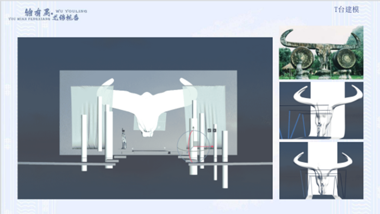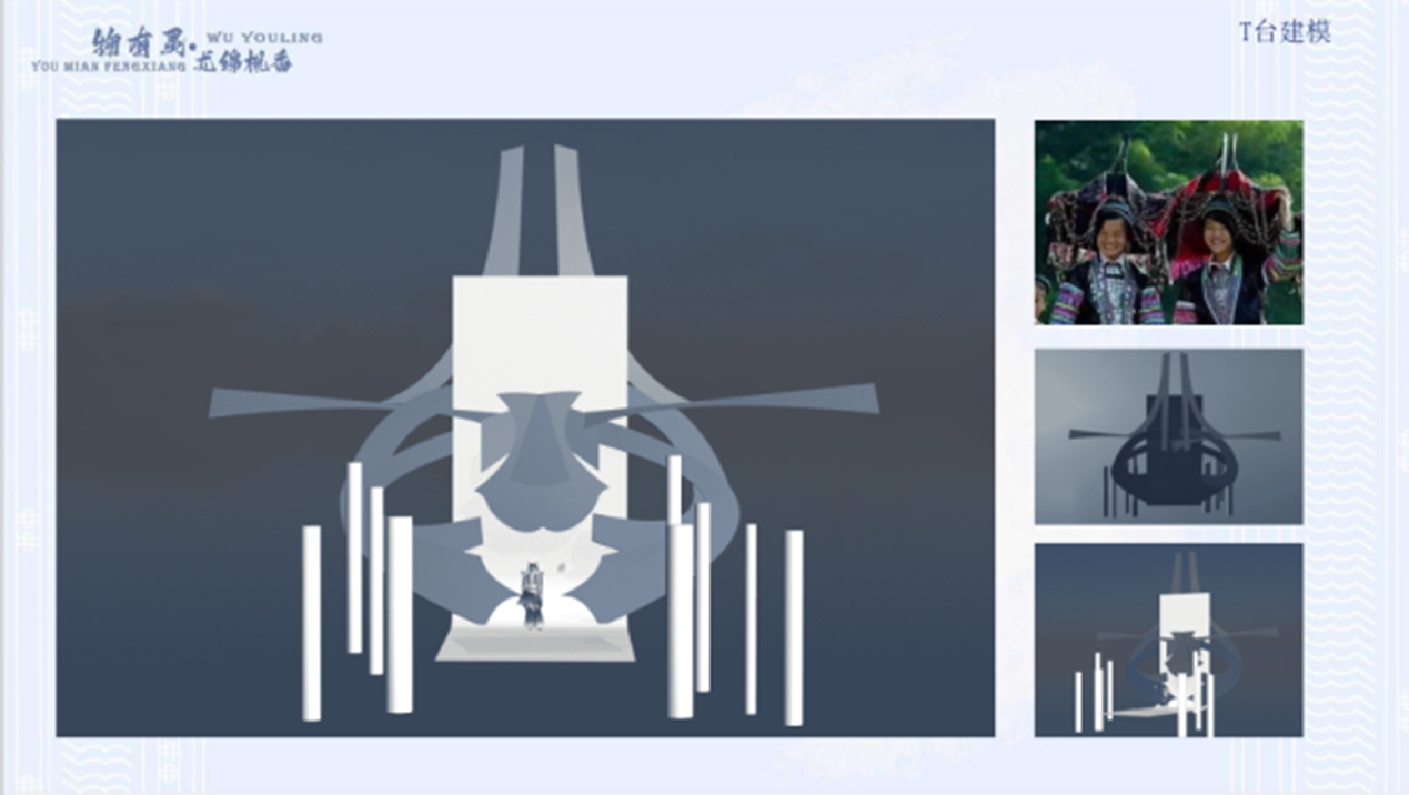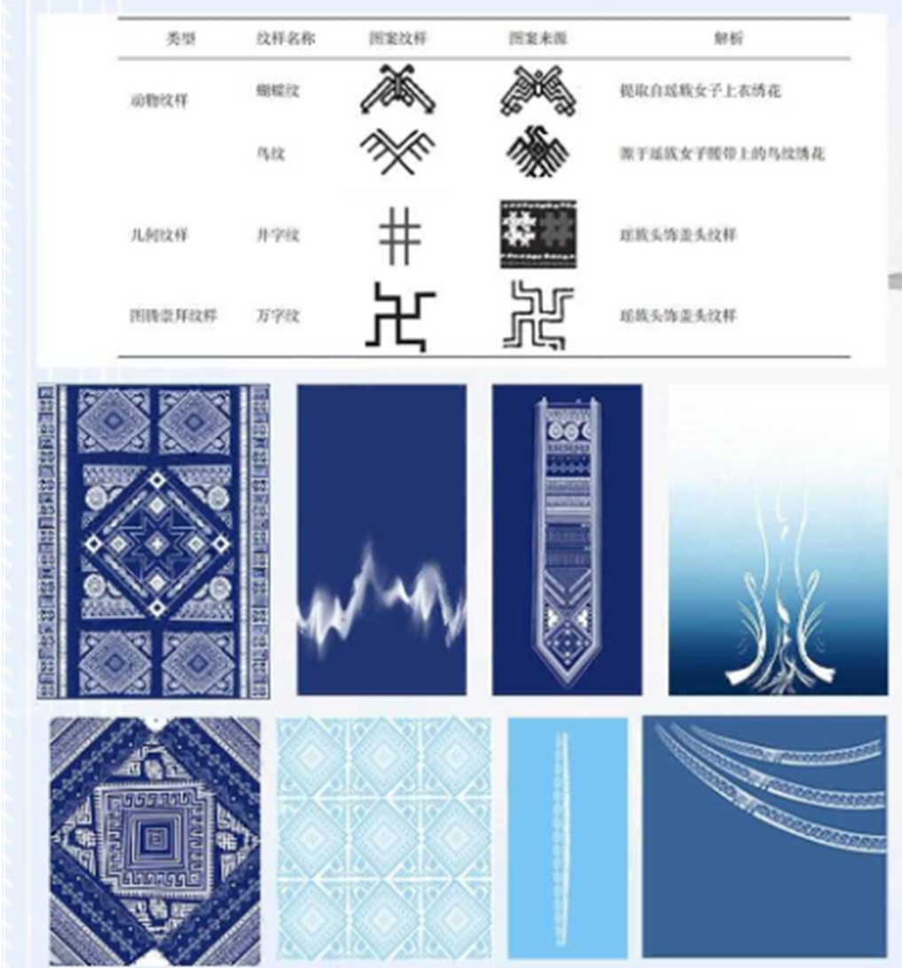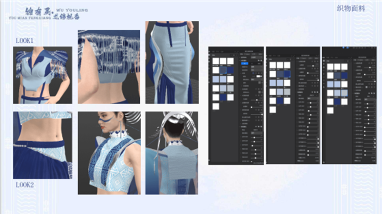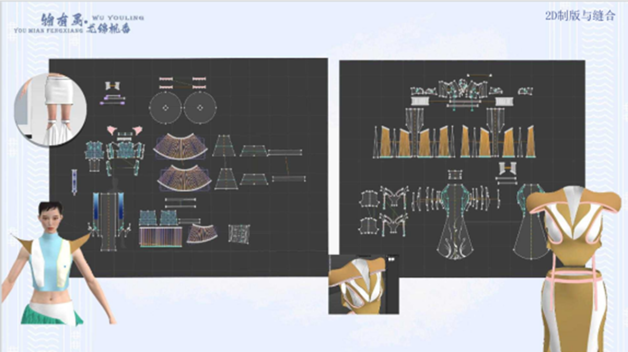 《物有灵——尤绵枫香》的灵感来源于瑶族传统工艺中的蜡染,将瑶族服饰元素运用到现代礼服设计中的创作。在这次的融合设计中,选取瑶族的动物纹样、几何纹样及图腾崇拜纹样进行提炼和重构,使用stlye3D2D制版技术以及3D虚拟仿真技术展现传统工艺的艺术魅力,以时尚产业数字化推动民族服饰创新发展。