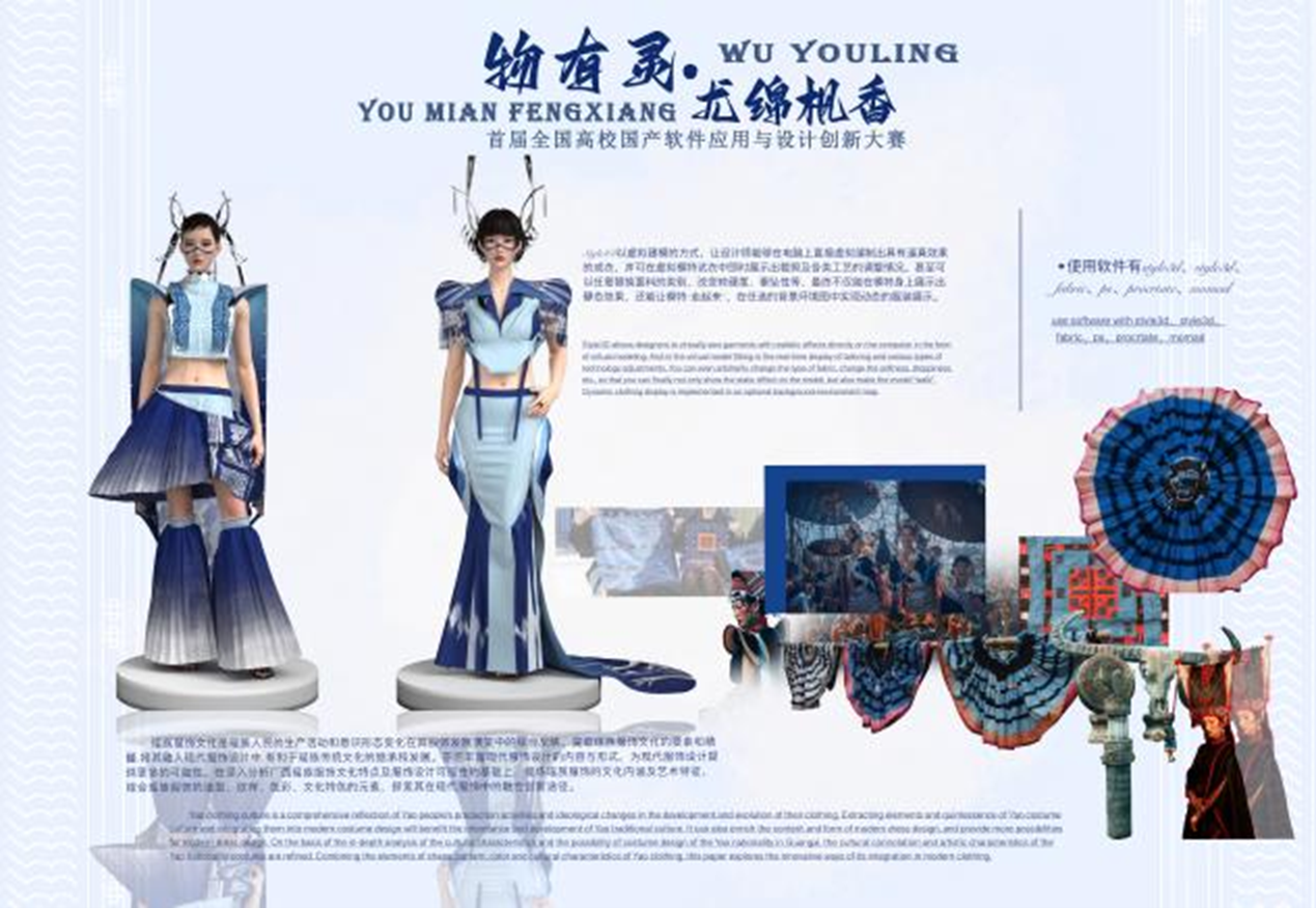 日前,由浙江大学机器人研究院、浙江大学国际设计研究院、浙江省工程图学学会承办的首届全国高校国产软件应用与设计创新大赛(以下简称“国产软件大赛”)落下帷幕。浙艺设计学院服装与服饰设计专业学生叶嘉艺、陈翾的作品《物有灵——尤绵枫香》荣获一等奖,指导教师项敢、巴蕾获优秀指导教师称号。
