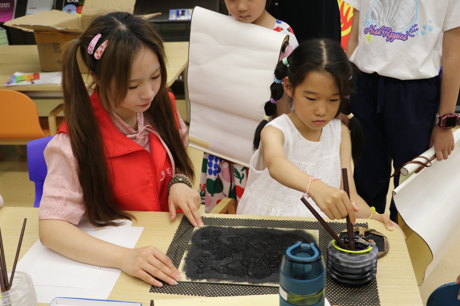 在水印木刻体验中,“艺小匠”详细讲解了水印木刻的印制流程及印制工具。在“艺小匠”的指导下,参与体验的小朋友们将蘸取墨水的刷子在木板上刷色,均匀涂抹版面,观察好版面的位置后把宣纸对准印版平铺,借助马莲来回旋转按压,使纸面和版面上的墨充分接触。
