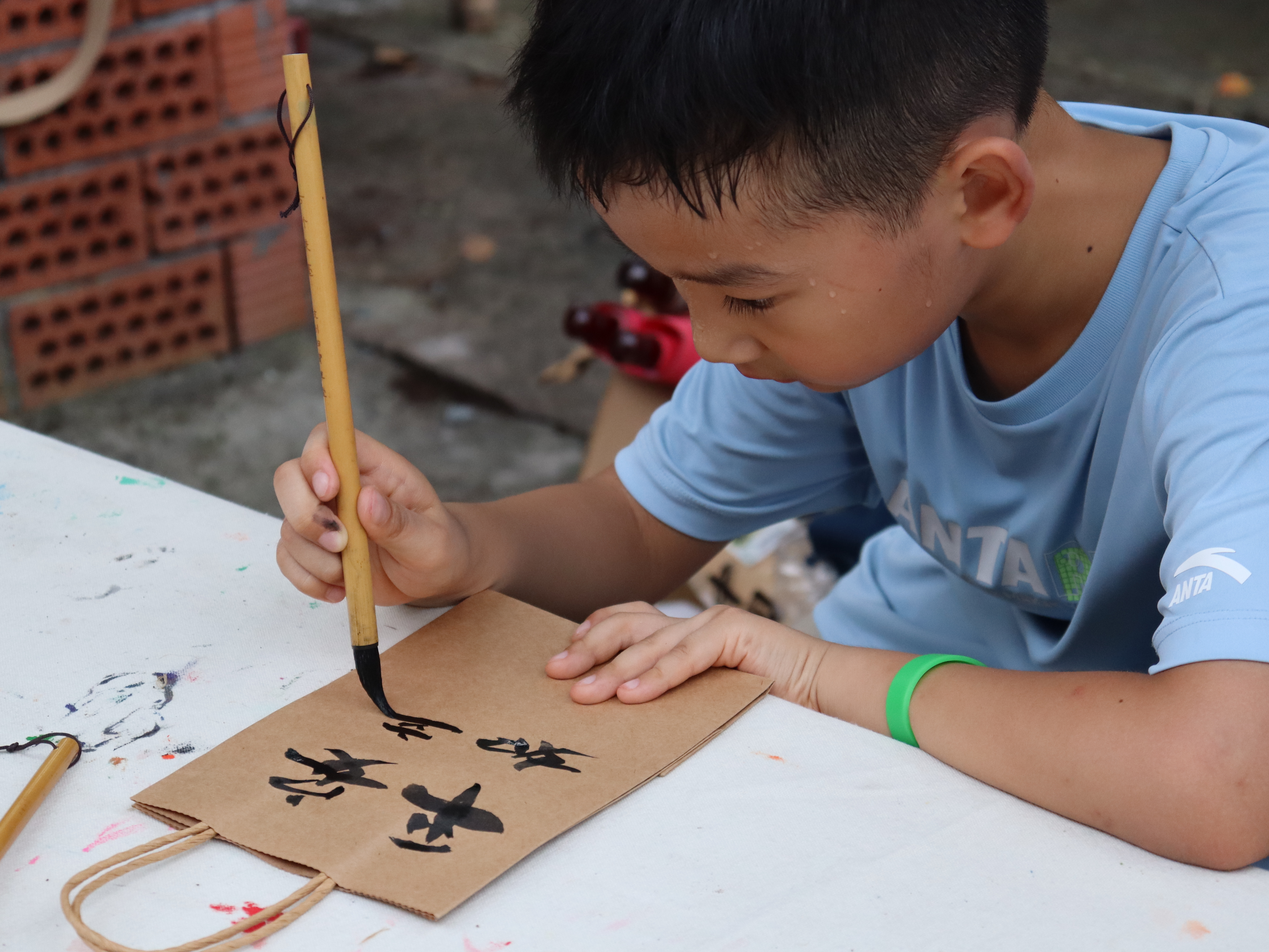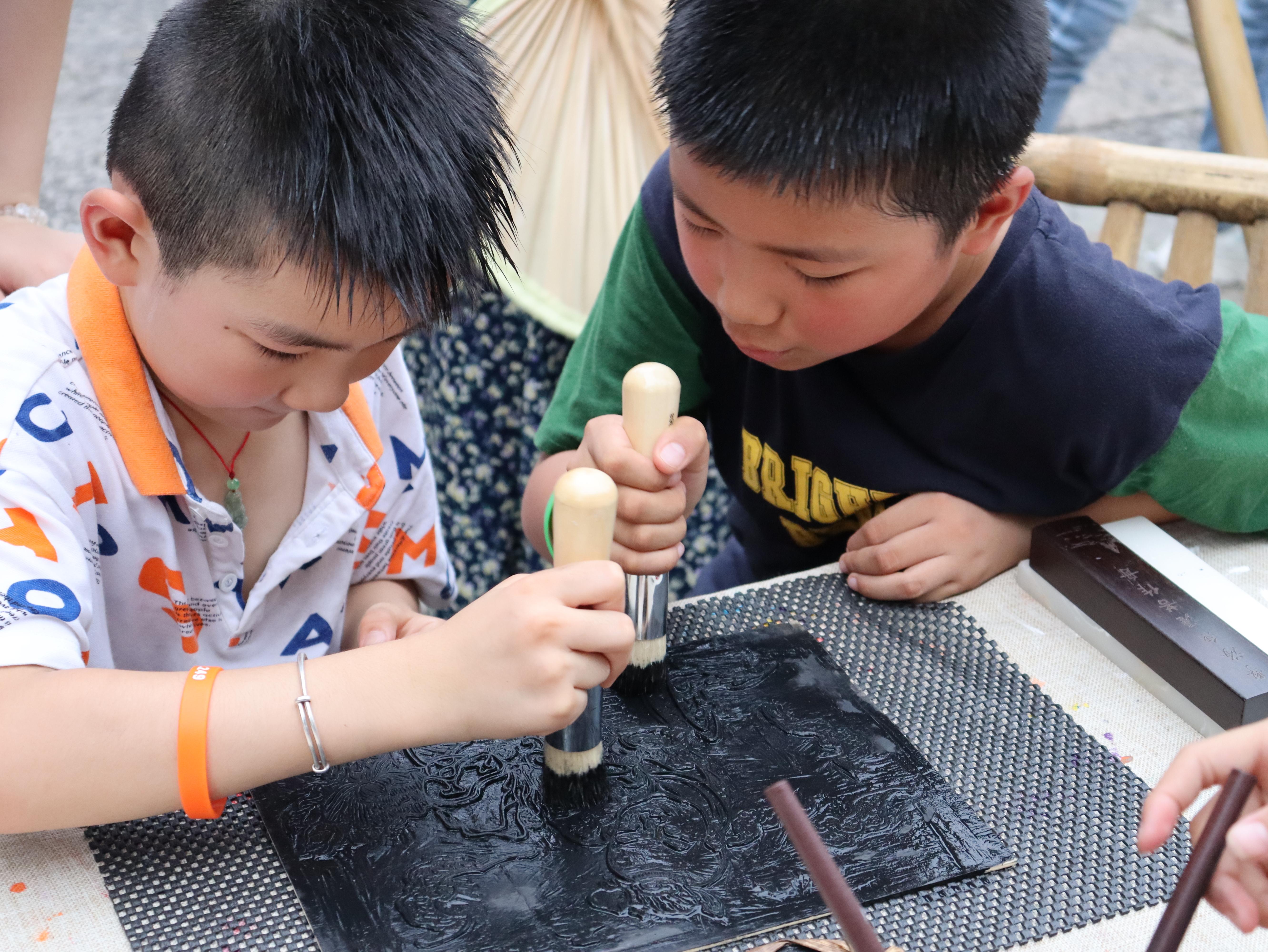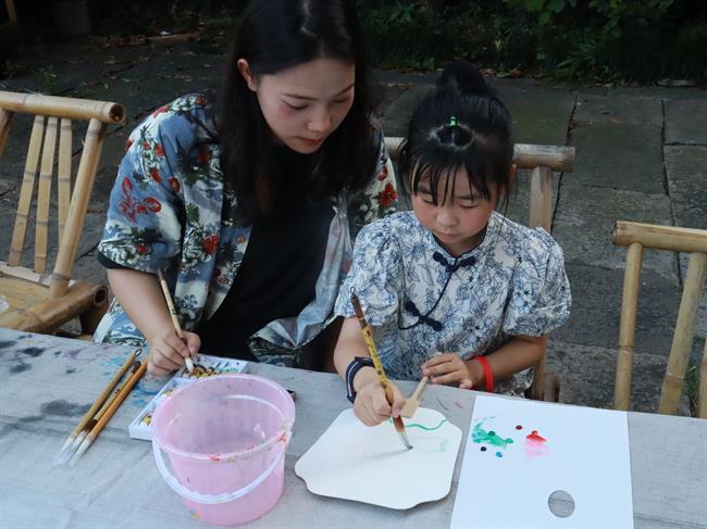 童心巧绘精彩。游客们充分发挥想象力和动手能力,巧手点缀扇面、陀螺,将其幻化为独一无二的作品。