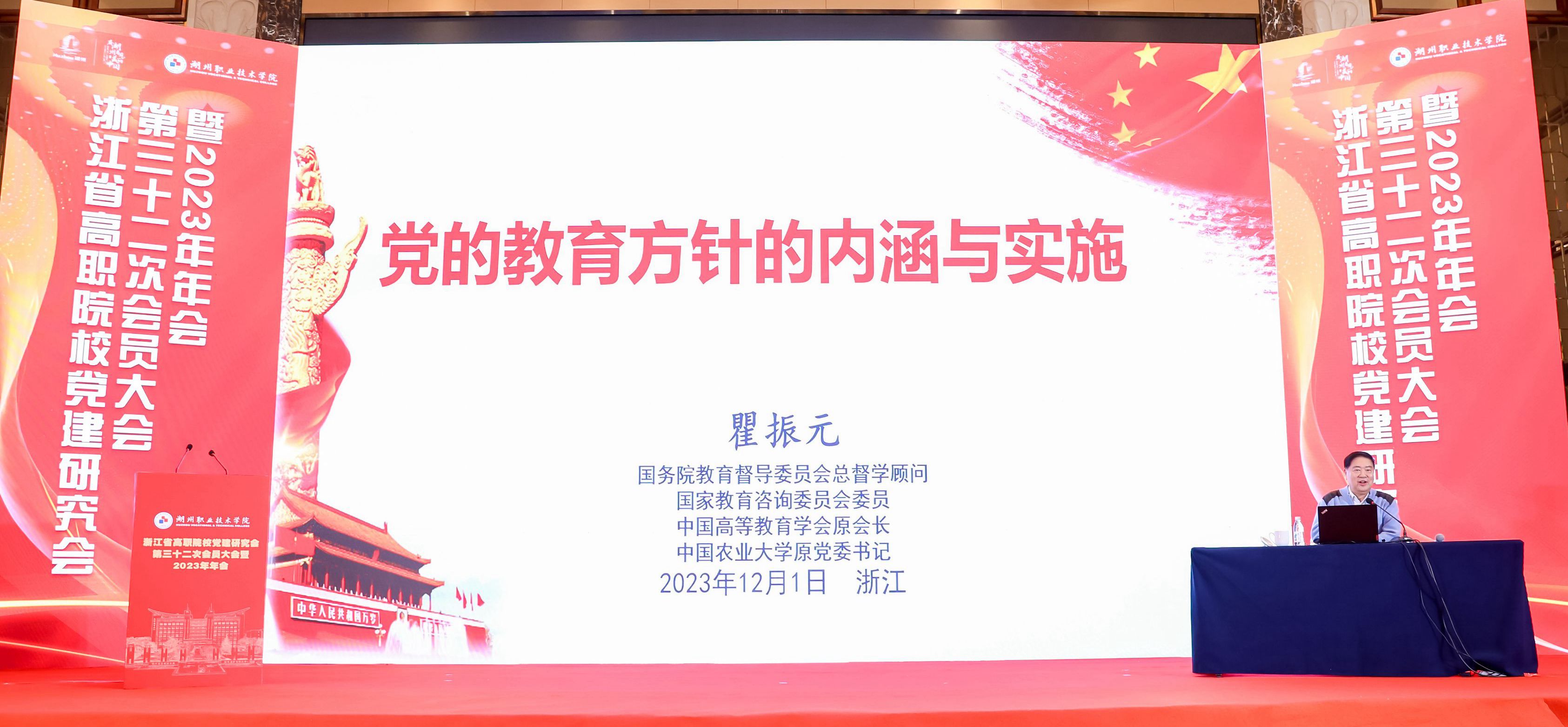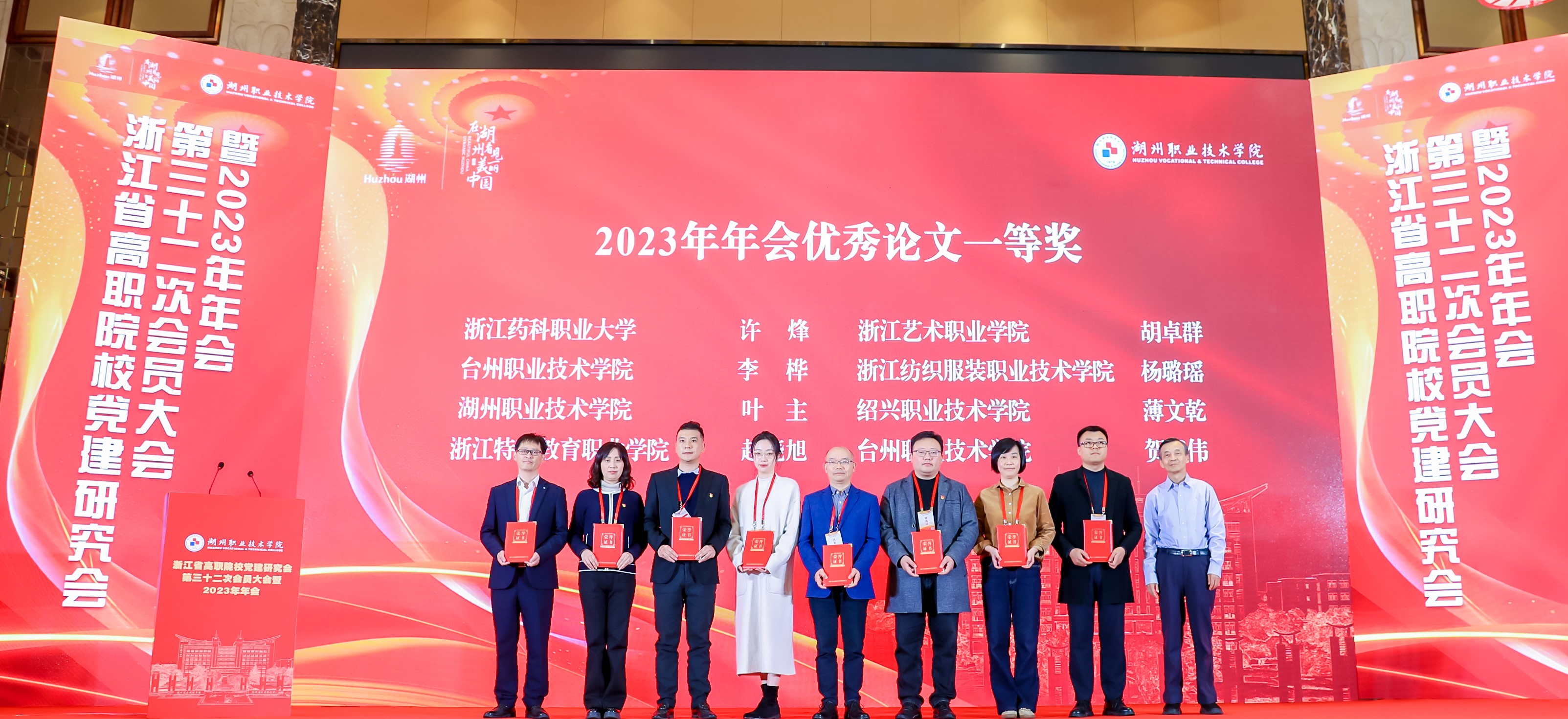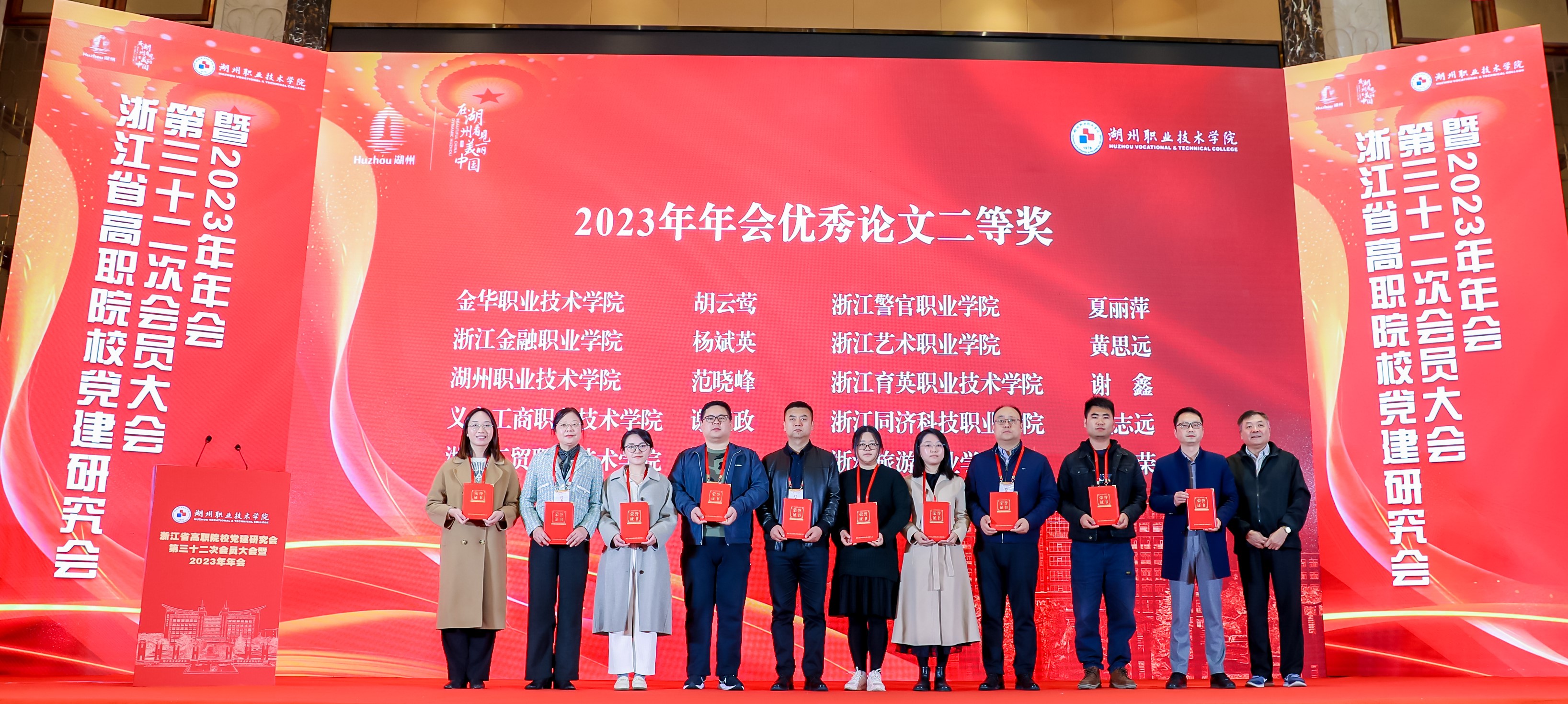11月30日至12月2日,浙江省高职党建研究会第三十二次会员代表大会暨2023年年会在湖州举行。本次年会以“学习贯彻习近平新时代中国特色社会主义思想,推动高职教育高质量发展”为主题,中国高等教育学会第六届理事会会长瞿振元,湖州市委常委、副市长阮叶萍,省教育厅组织处处长陈钦林,全国高职高专党委书记论坛主任委员会主任委员、新疆工程学院党委书记李玉鸿,教育部职业教育发展中心研究员赵伟,中国教育学会教育新闻分会常务副主任委员汪大勇,中国教育在线副总裁赵欣,省高职院校党建研究会会长、浙江金融职业学院原党委书记周建松,来自北京、新疆、贵州和省内各高职院校党委书记、党委副书记、组织部部长、宣传部部长、思政教育工作者等200余名代表参加会议。研究会常务理事、我校党委副书记夏开堂,研究会理事、校党委委员、宣传部部长、统战部部长马向东和我校获奖代表参会。