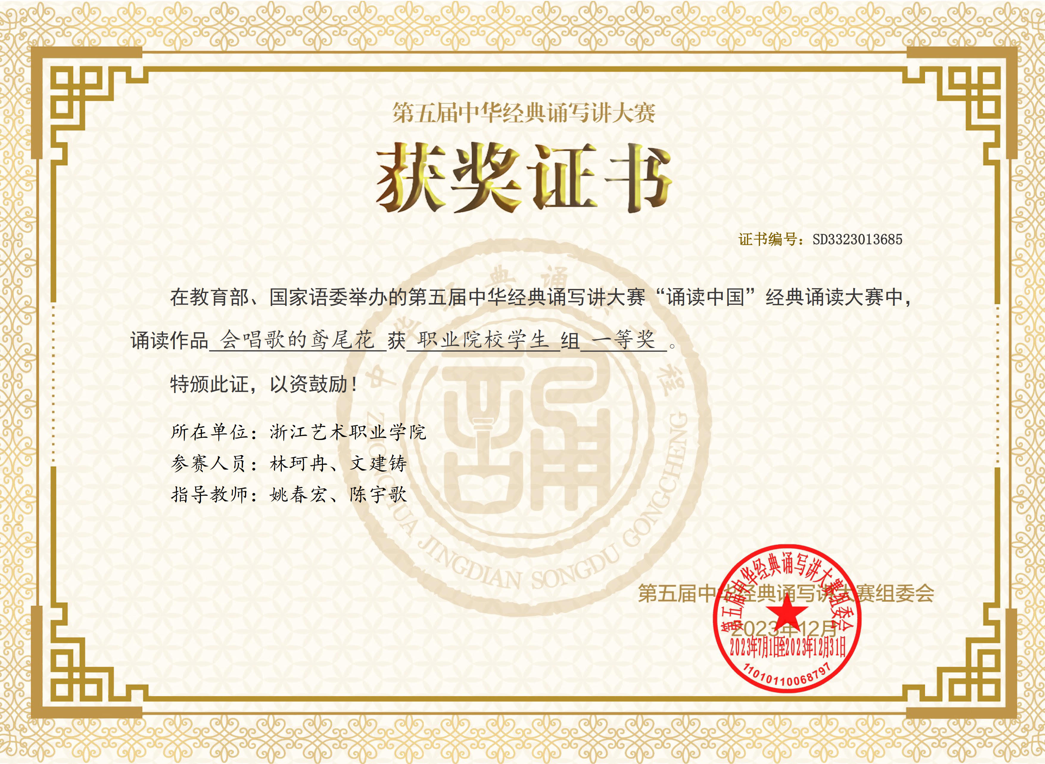 近日,由教育部、国家语委举办的第五届中华经典诵写讲大赛落下帷幕。浙江艺术职业学院戏剧影视学院作品《会唱歌的鸢尾花》和《红铁》在“诵读中国”经典诵读赛项中荣获国家级职业院校学生组一等奖,指导老师那刚、姚春宏、陈宇歌获“优秀指导教师”称号。