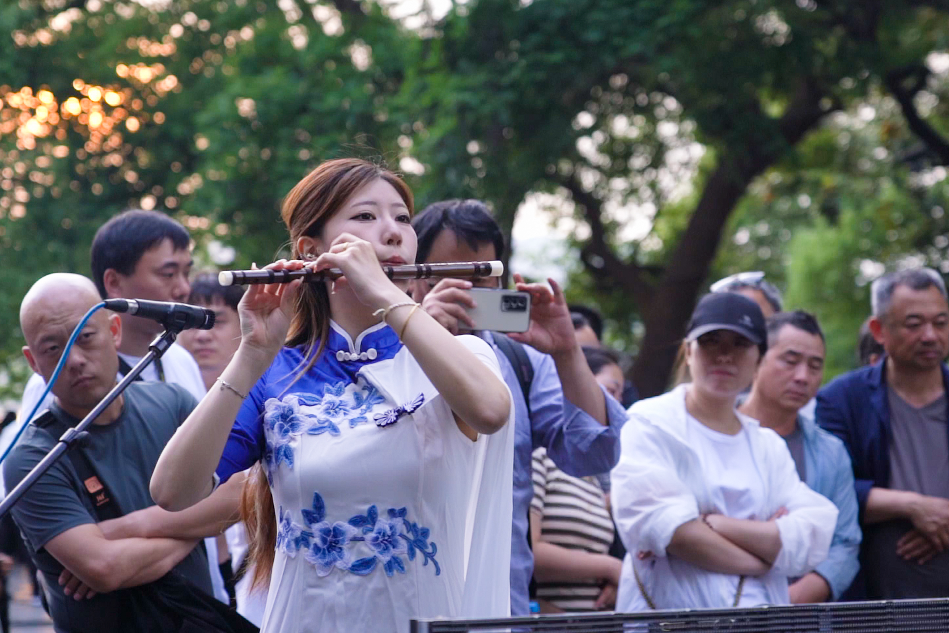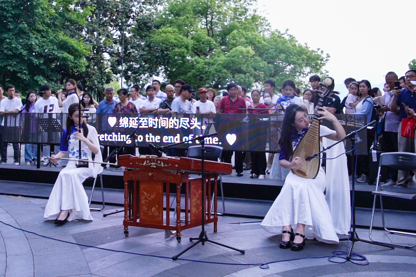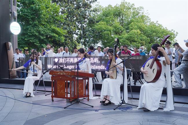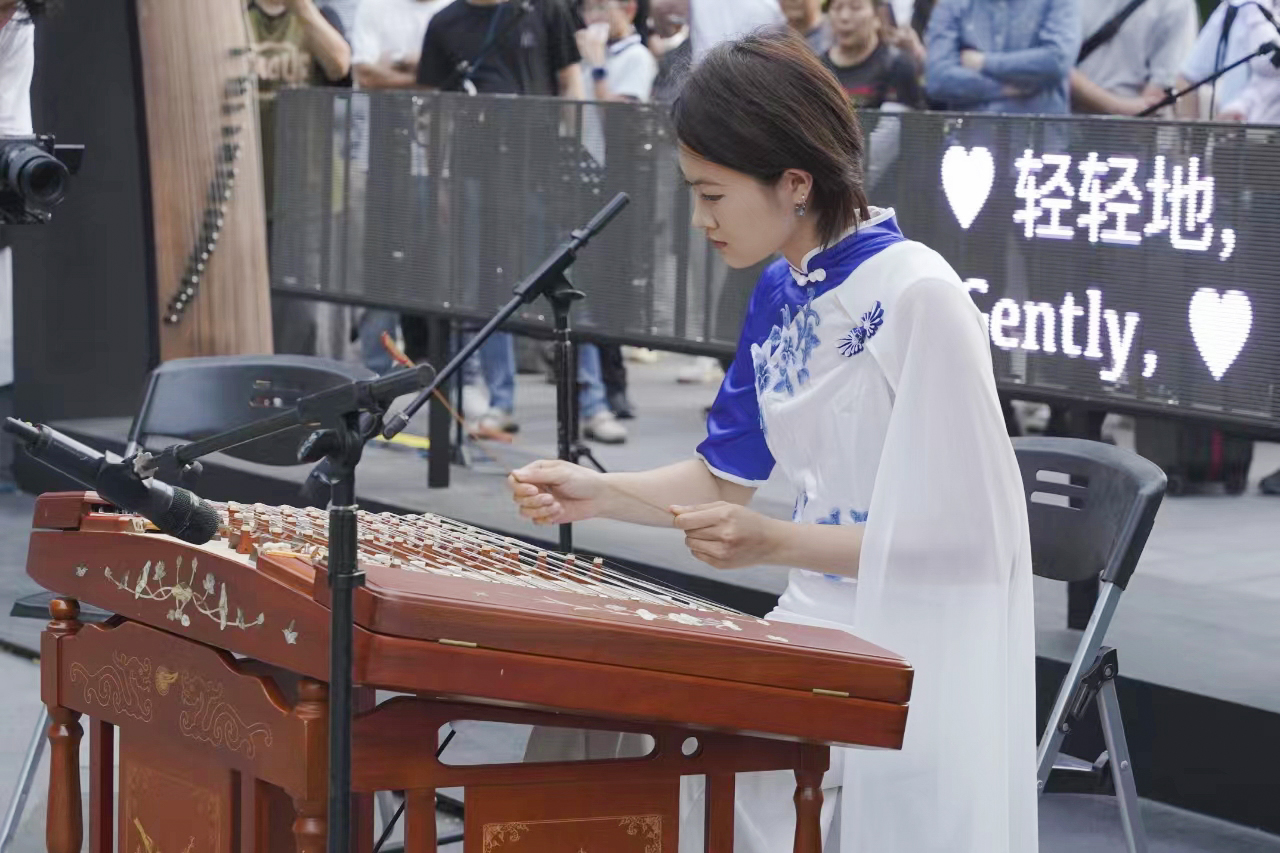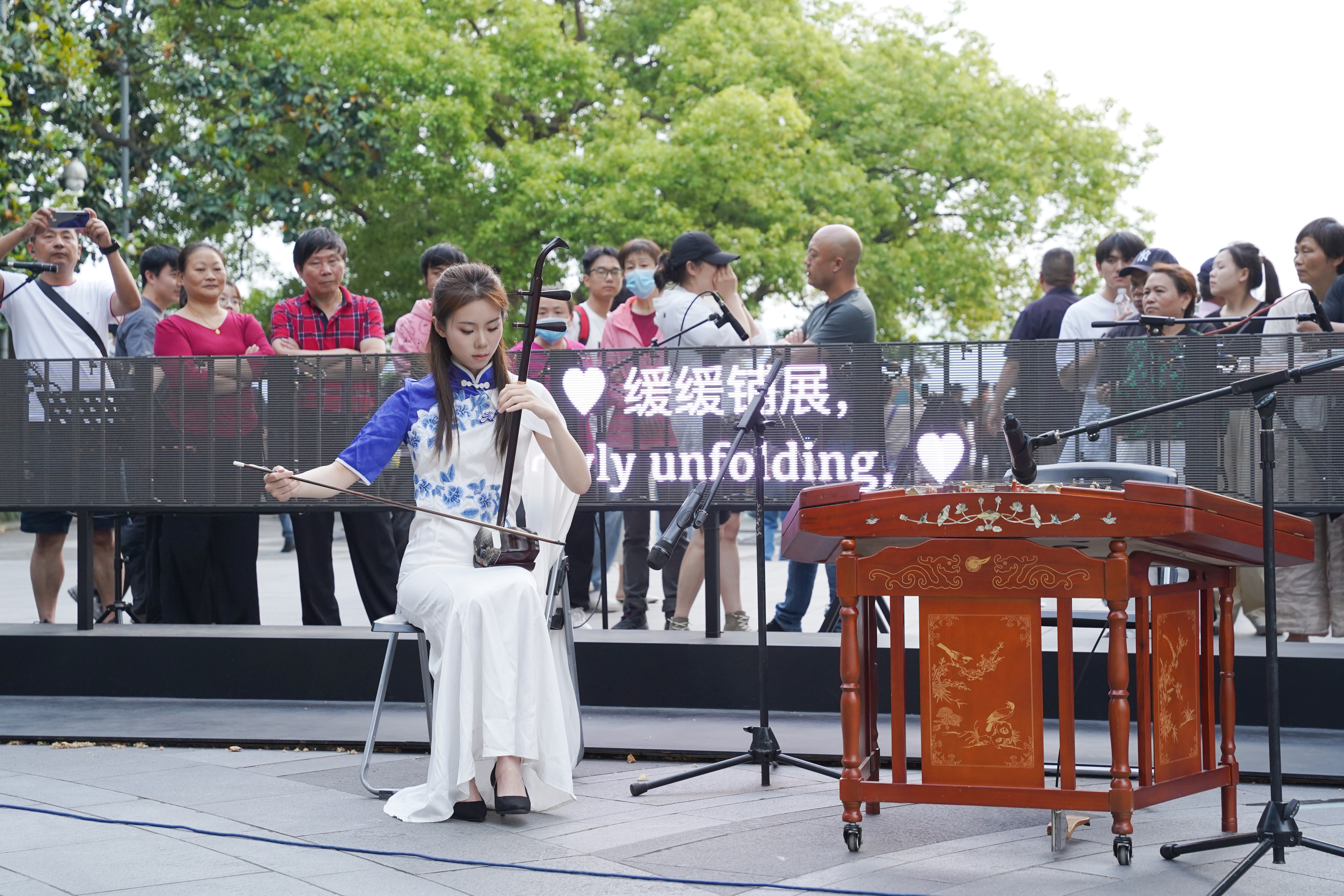 这场音乐会被誉为“盲盒音乐会”,通过整合艺术院校、专业院团的资源,来丰富和活跃群众文化生活,让艺术走进群众,进一步提升公共文化服务的质量和水平。结合“文艺赋美”工程,音乐学院“江南女乐”乐团在如诗如画的西湖边用中国传统乐器演奏动人的乐曲,观众们早早的围坐成圈等待演出,这次的专场演出,乐团准备的曲目大部分以江南风格、浙江音乐为主,如《忆江南》《苏堤漫步》《采茶舞曲》等。在音乐响起的那一刻,大家都安静下来仔细聆听,也吸引了众多行人驻足欣赏。观众们感叹:“江南风光与民乐的交织简直太浪漫!这种艺术形式能更直观的传递情感,让路过的游人都能产生幸福感,将优美艺术呈献给观众的同时也传达了积极向上的价值观。”