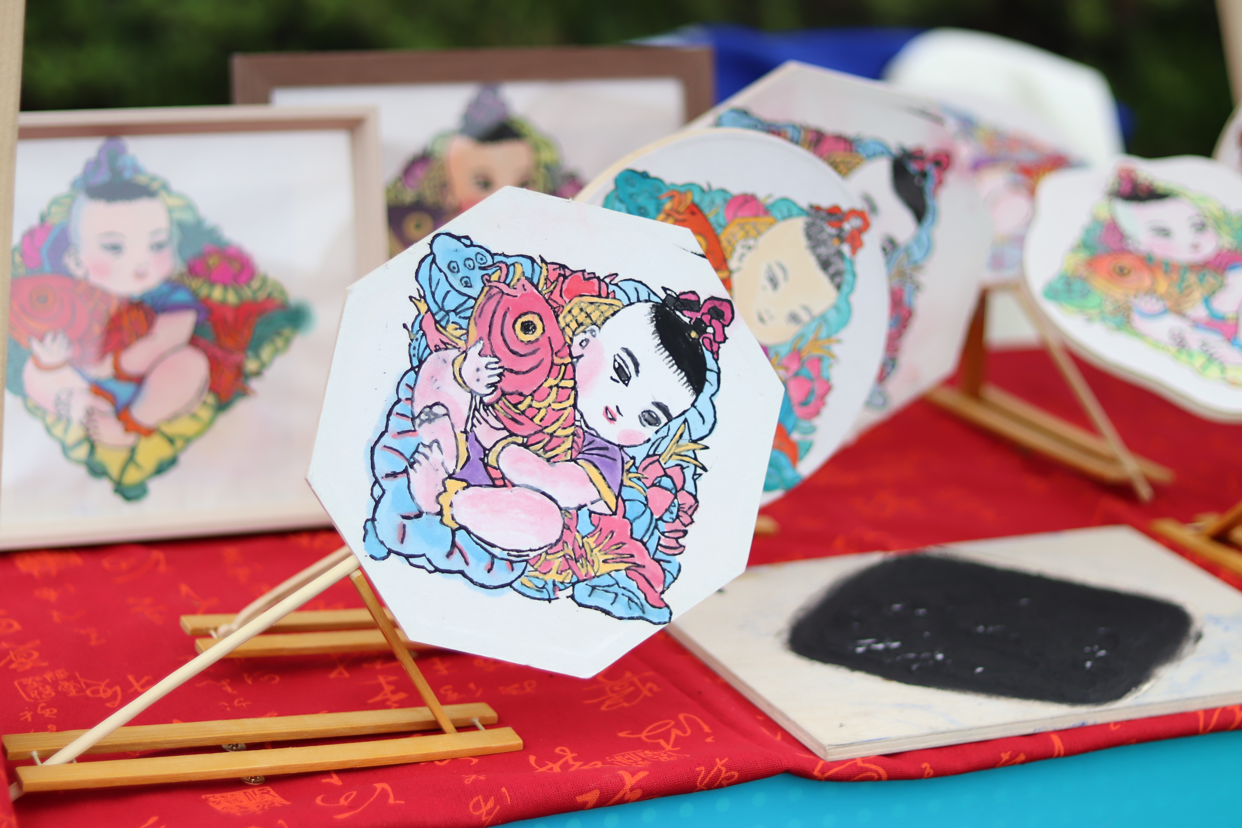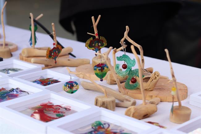 活动现场人头攒动,一个个摊位上的文创产品琳琅满目。中国传统书画跃身于灯笼、香薰蜡烛、书签、纸伞、纸扇、挂件之上,与创意产品完美结合,精致美观又充满文化气息,引得现场观众频频驻足,争相购买。大家在一件件扇面和书签中体悟融入生活中的艺术,从火漆印章和香薰蜡烛中感受传统文化的新魅力。值得一提的是,师生们还为戴村镇大石盖村开发了系列文创产品,也受到一致好评。