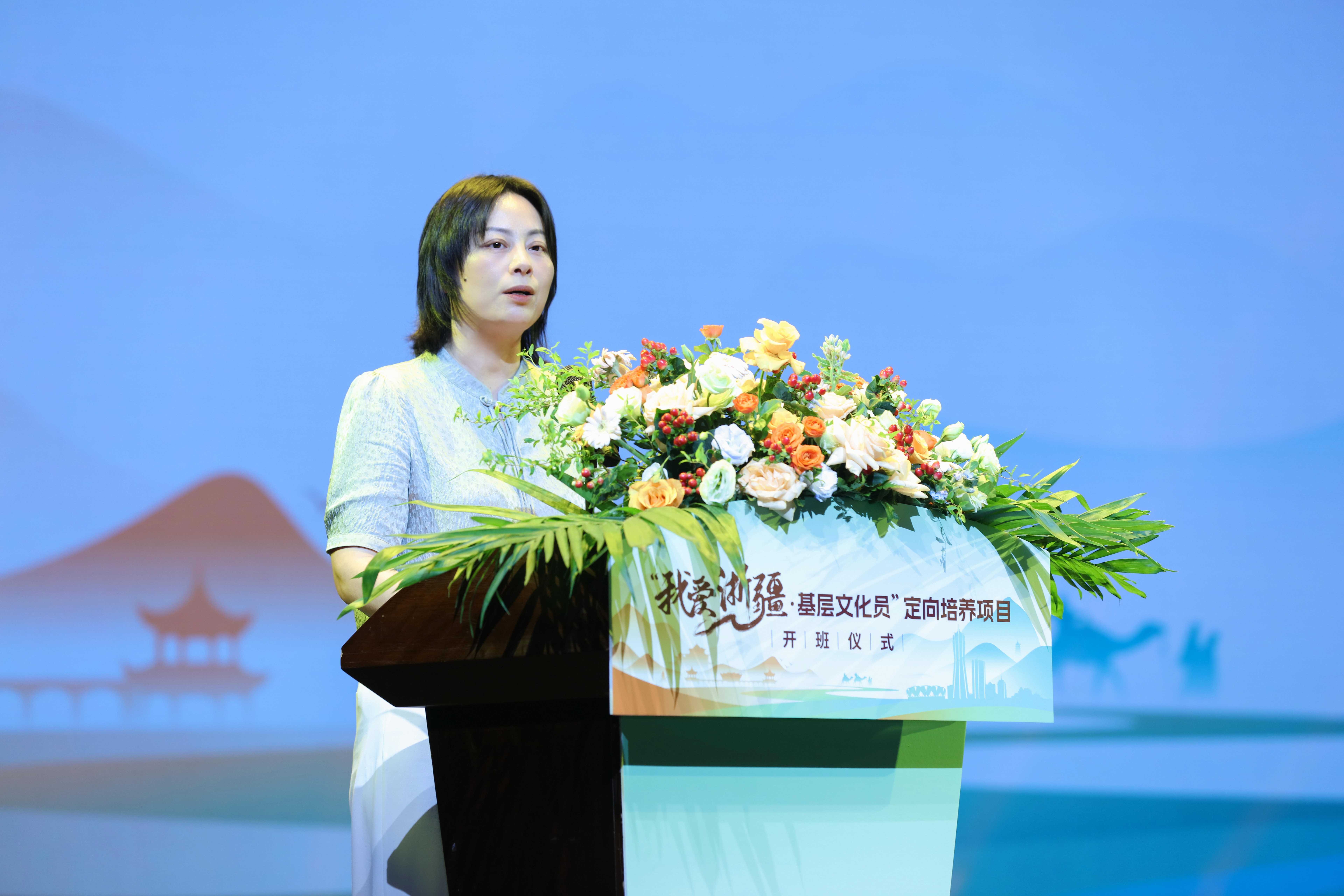 骆梅英在讲话中强调,培育基层文化队伍是创业之基、兴业之要,也是浙阿两地的共同需求、共同使命。她表示,浙江援疆坚持以增强认同为目标,携手推进基层文化员的定向培养工作。通过打造一支有文气、接地气、扬正气的基层文化队伍,不断夯实“文化润疆”的基层基础,努力实现从“送文化”到“种文化”的转变。浙江艺术职业学院自2017年开始承担乡镇文化员定向培养工作,积累了丰富的办学经验和优质的教学资源,希望同学们珍惜这次难得的学习机会,努力成为阿克苏文化建设的生力军。
