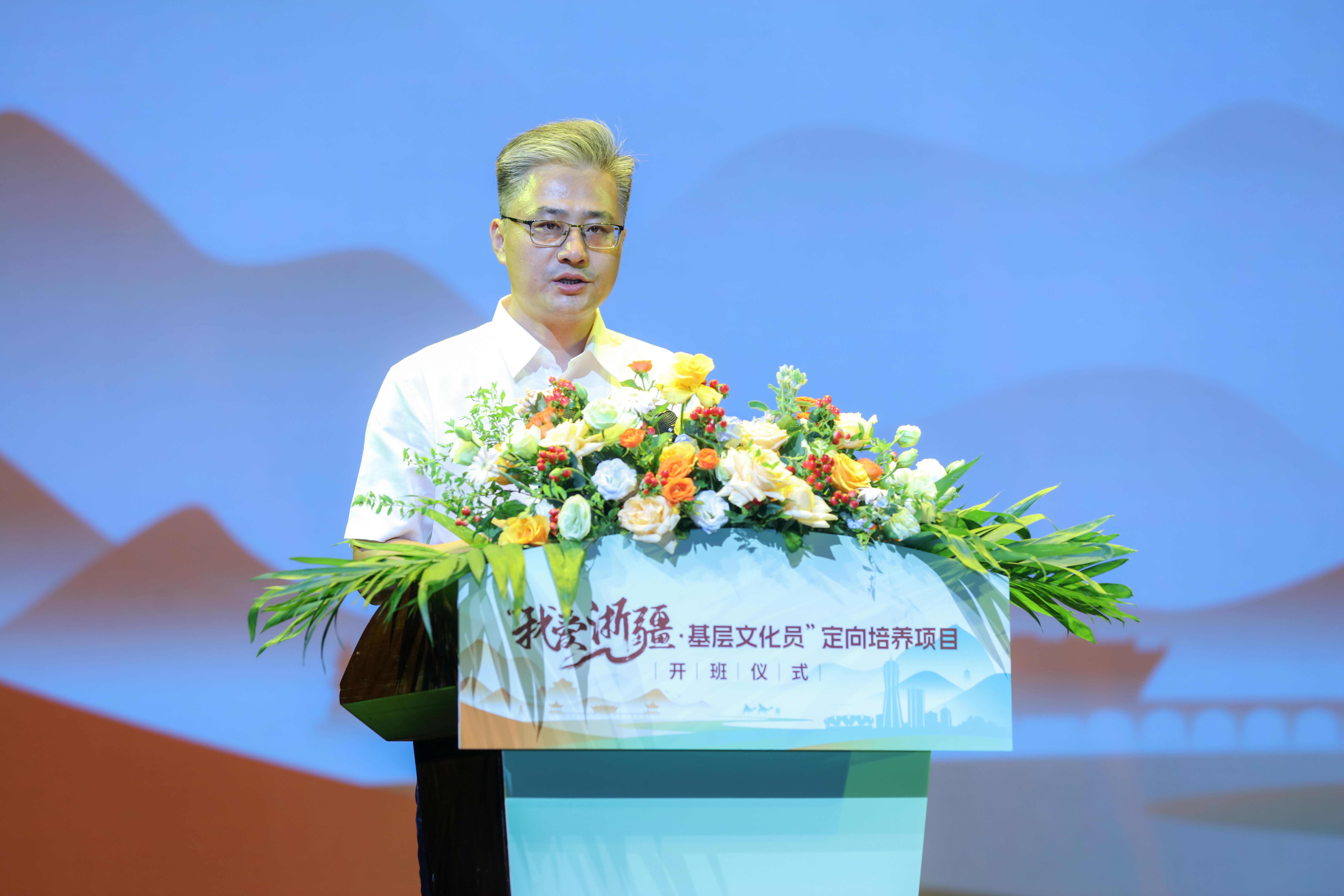 来颖杰代表浙江省委宣传部对项目的启动表示热烈祝贺。他指出,乡镇文化员定向培养是浙江省2017年推出的一项重大制度创新,旨在更好地建强基层公共文化服务人才队伍。多年的实践表明,浙江乡镇文化员定向培养已成为深化“千万工程”建设的重要抓手,也是丰富基层群众文化共富、精神富有的民生项目。浙江艺术职业学院作为培养单位,已招收七届共331名定向生,形成了许多可复制、可借鉴、可推广的经验做法。“我爱浙疆·基层文化员”项目由浙江艺术职业学院与新疆理工学院合作开展,恰逢其时,意义重大,有望为援疆再添新亮点、为文化润疆再创新模式。该项目不仅是文化的双向交流,更体现了两地的深厚合作。他强调,“文化润疆”架起的是民心之桥,应深化两地人文交流,做强品牌载体,提升群众获得感,并建立长效培养机制,持续创新模式,确保每位文化员都能担当起以文惠民、以文兴业、以文润村的重任。