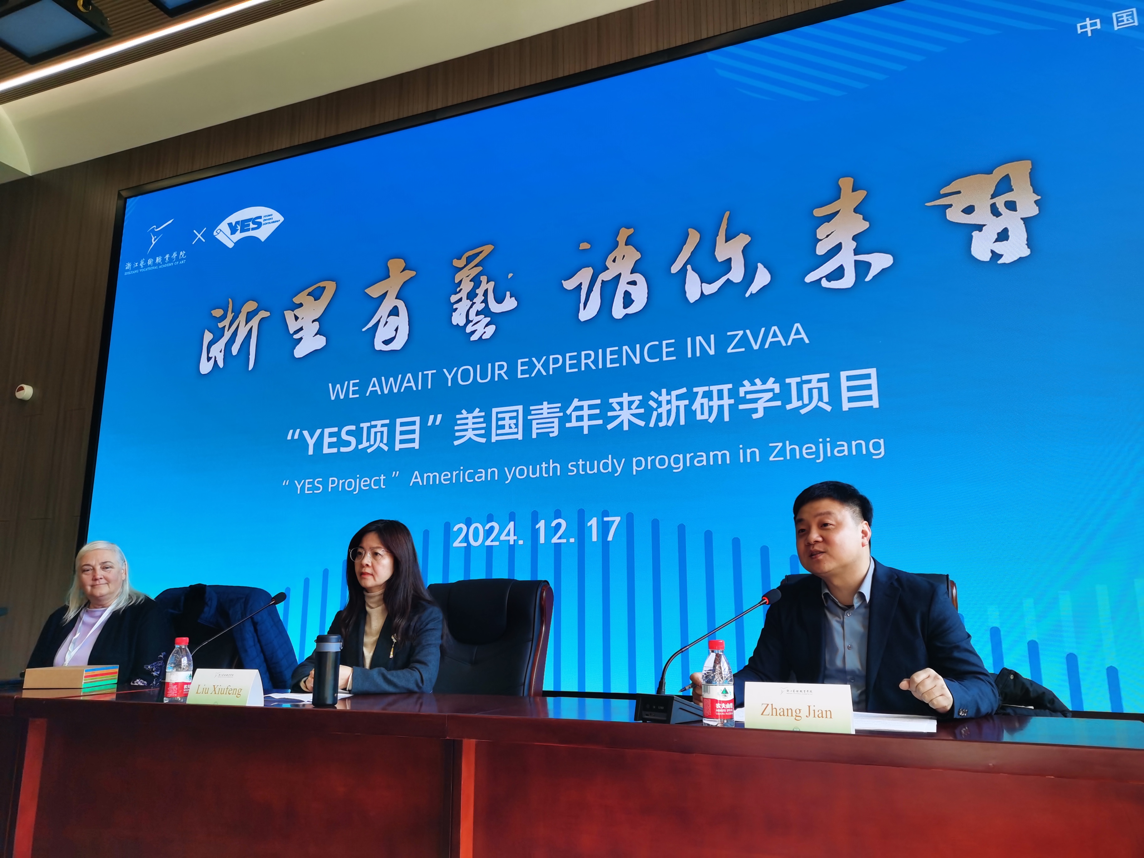 1217日上午,浙江艺术职业学院新教学综合楼小报告厅内洋溢着热情友好的气氛,21名美国师生齐聚一堂,共同期待着美国青年来浙研学项目——YES”项目的开班。开班仪式由我校国际学院院长张健主持。