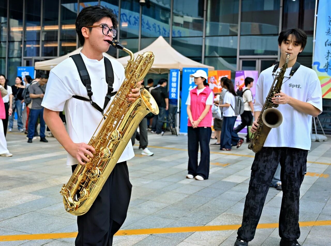 新教学综合楼中心广场上,校学生会搭建起临时舞台,带来一场场精彩纷呈的迎新演出。燃炸全场的街舞、优雅深情的萨克斯四重奏、引发共鸣的流行金曲串烧……表演者们全情投入,赢得现场阵阵掌声与欢呼。刚完成报到的新生李同学兴奋地说:“没想到一进校门就有这么精彩的演出,瞬间拉近了和学校的距离,太期待未来的大学生活了!”舞台边,“青春咨询台”也吸引了许多新生驻足。校学生会同学积极为新生介绍社团活动、校园赛事等,帮助新生提前规划大学生活。
