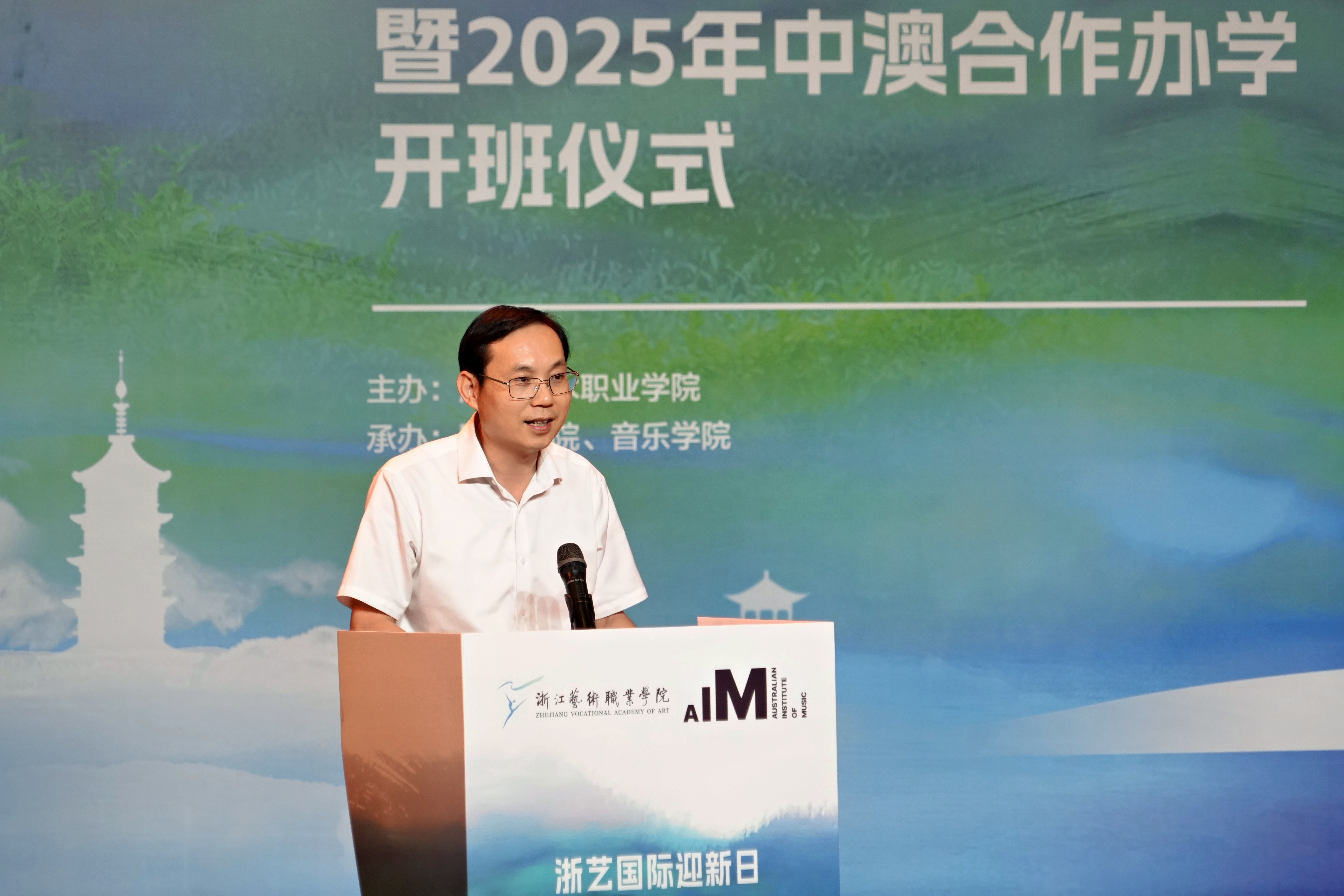 施俊天校长在欢迎辞中表示,艺术是跨越国界的语言,合作是推动发展的桥梁。中澳合作办学项目的启动,不仅是学校国际化进程的重要里程碑,更是培养具有全球视野艺术人才的关键一步。他希望同学们既能深入学习中国传统音乐的韵味精髓,也能汲取澳大利亚现代音乐教育的创新理念,在东西方文化的碰撞中找到属于自己的艺术表达。施校长还对学校首届来华留学生表示热烈欢迎,鼓励他们走进古琴课堂、参与艺术实践、感受杭州文化,让这段留学经历成为人生中最珍贵的美好记忆。