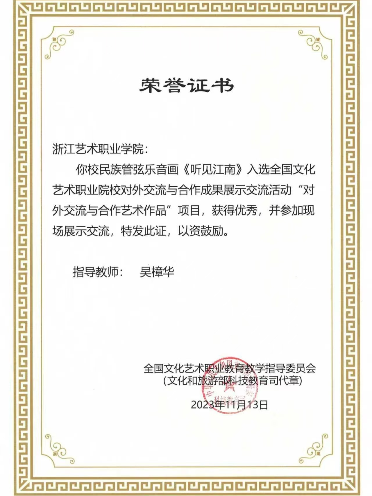 师生参与农村文化礼堂、送教下乡活动两次得到省委领导批示;连续7年、2000余人次参与国家级非遗“楼塔细十番”保护志愿服务;师生积极参与浙江省属院团新春展演季、杭州亚(残)运会开闭幕式演出、浙江省建党100周年文艺演出、G20峰会《最忆是杭州》演出、全国学运会开幕式演出等重大活动,先后获省级志愿服务“十佳项目”“优秀团队”“最美志愿者”“优秀组织工作者”等称号,在浙江高水平文化强省建设中扮演了服务标兵的角色。