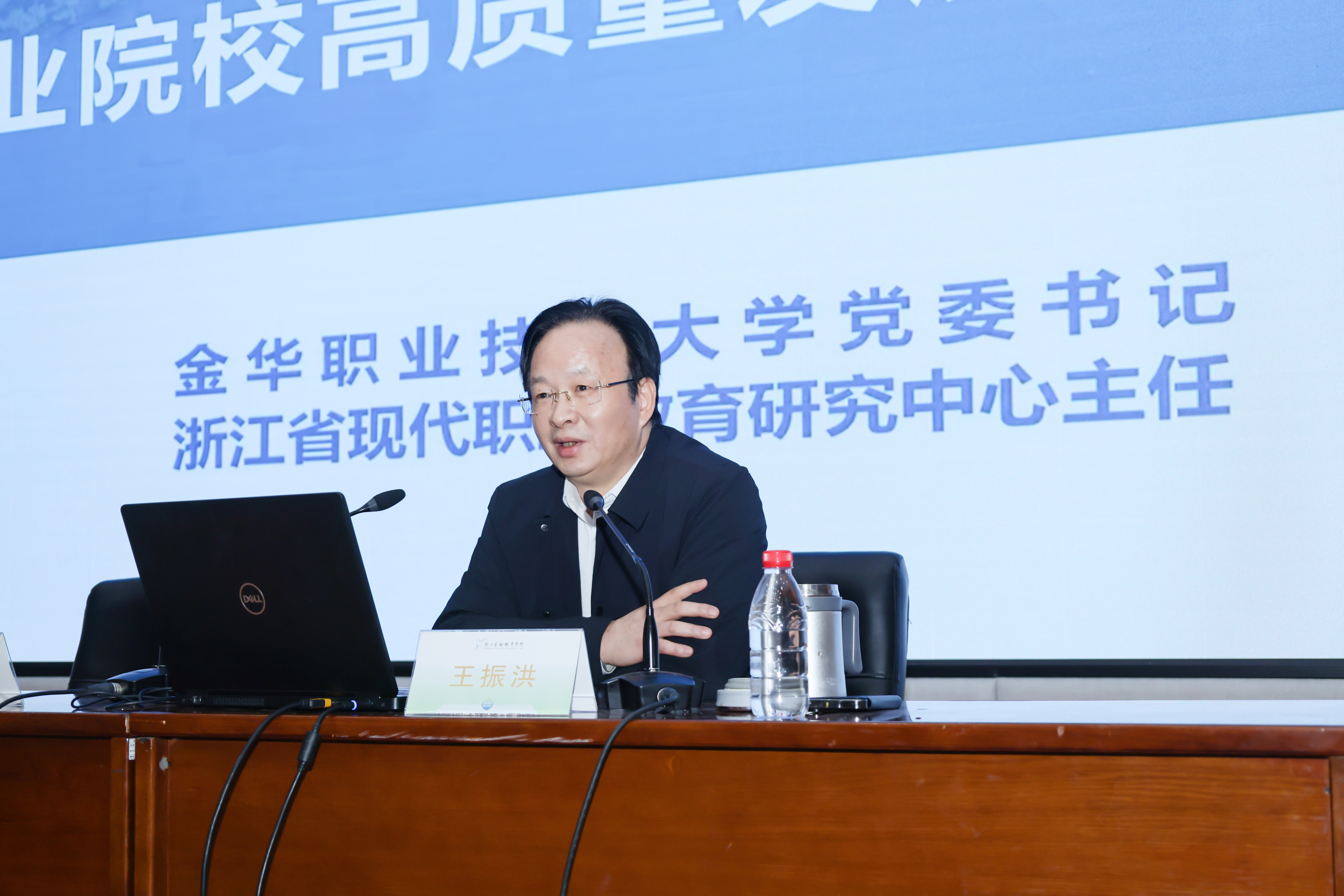 王振洪应邀作题为《“双高”领航:职业院校高质量发展的路径探索与实践》的专题报告,分享了金华职业技术大学在首轮“双高”建设中的探索与实践,为我校高质量发展提供了宝贵经验和前沿思考。