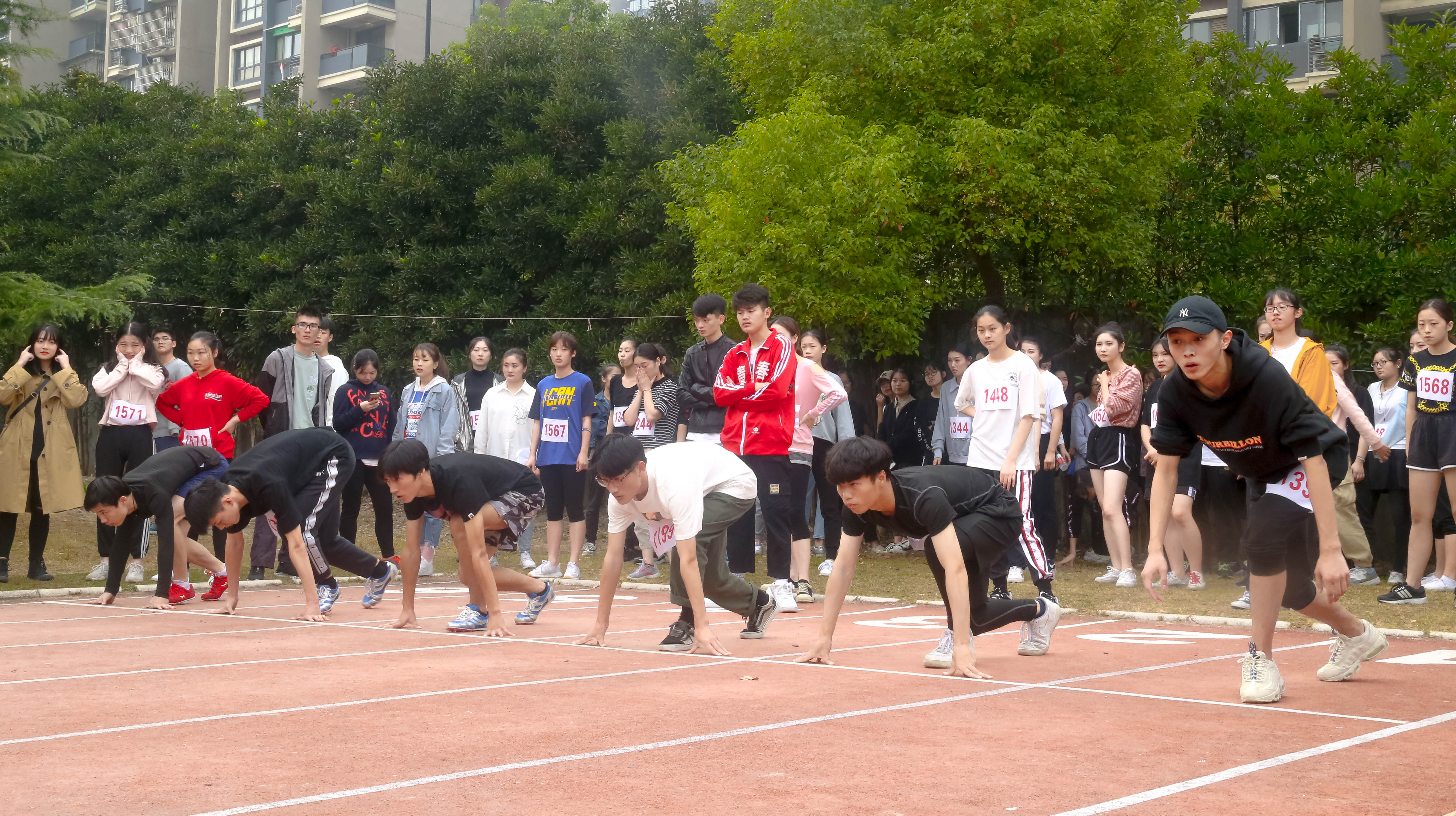 听,100米比赛的赛道上欢呼声一片,大家都在撑着伞给运动员们加油,而运动员们也不负重望,随着一声枪响,他们用自己最快的速度向前飞奔,如闪电一般,势不可挡!