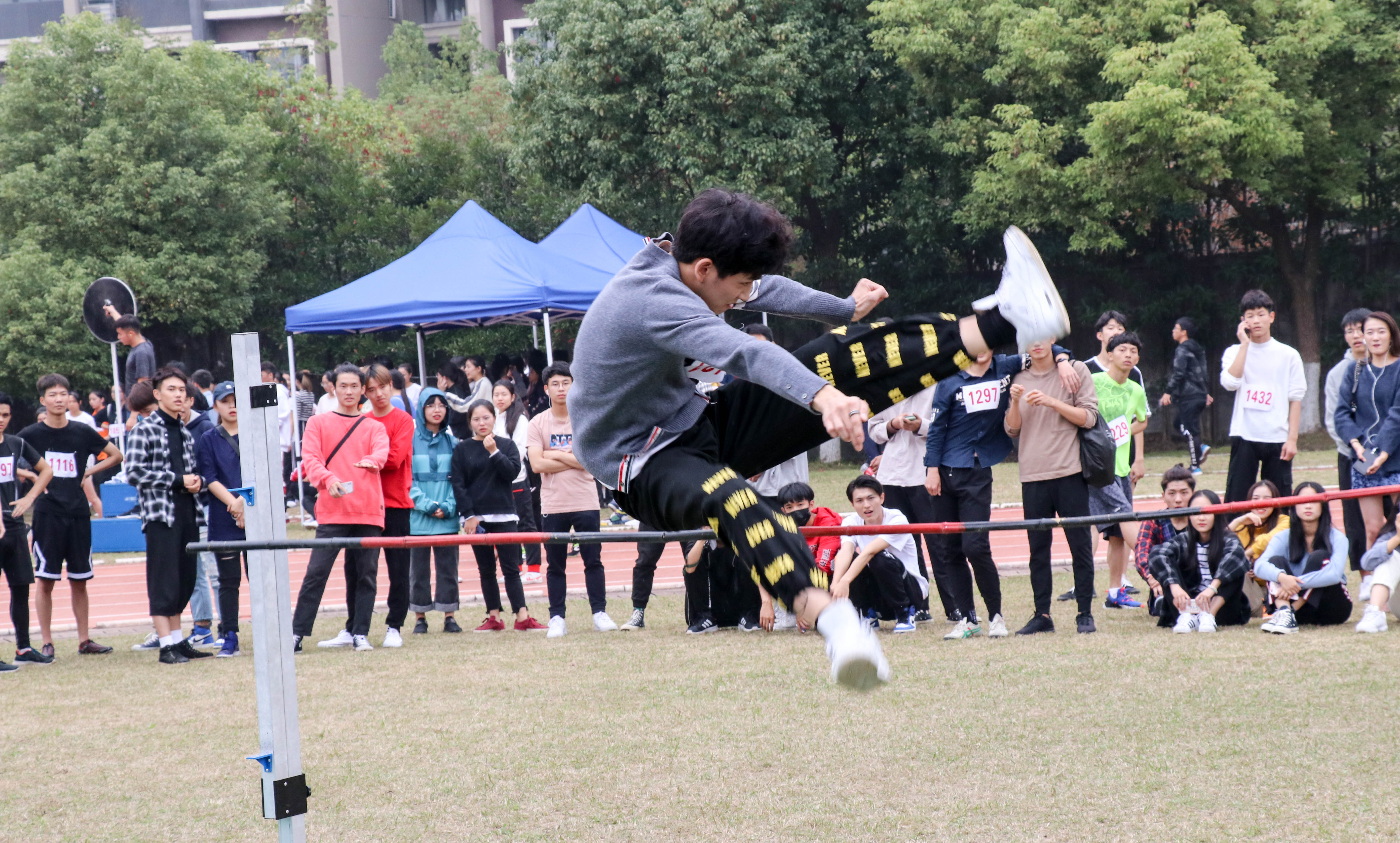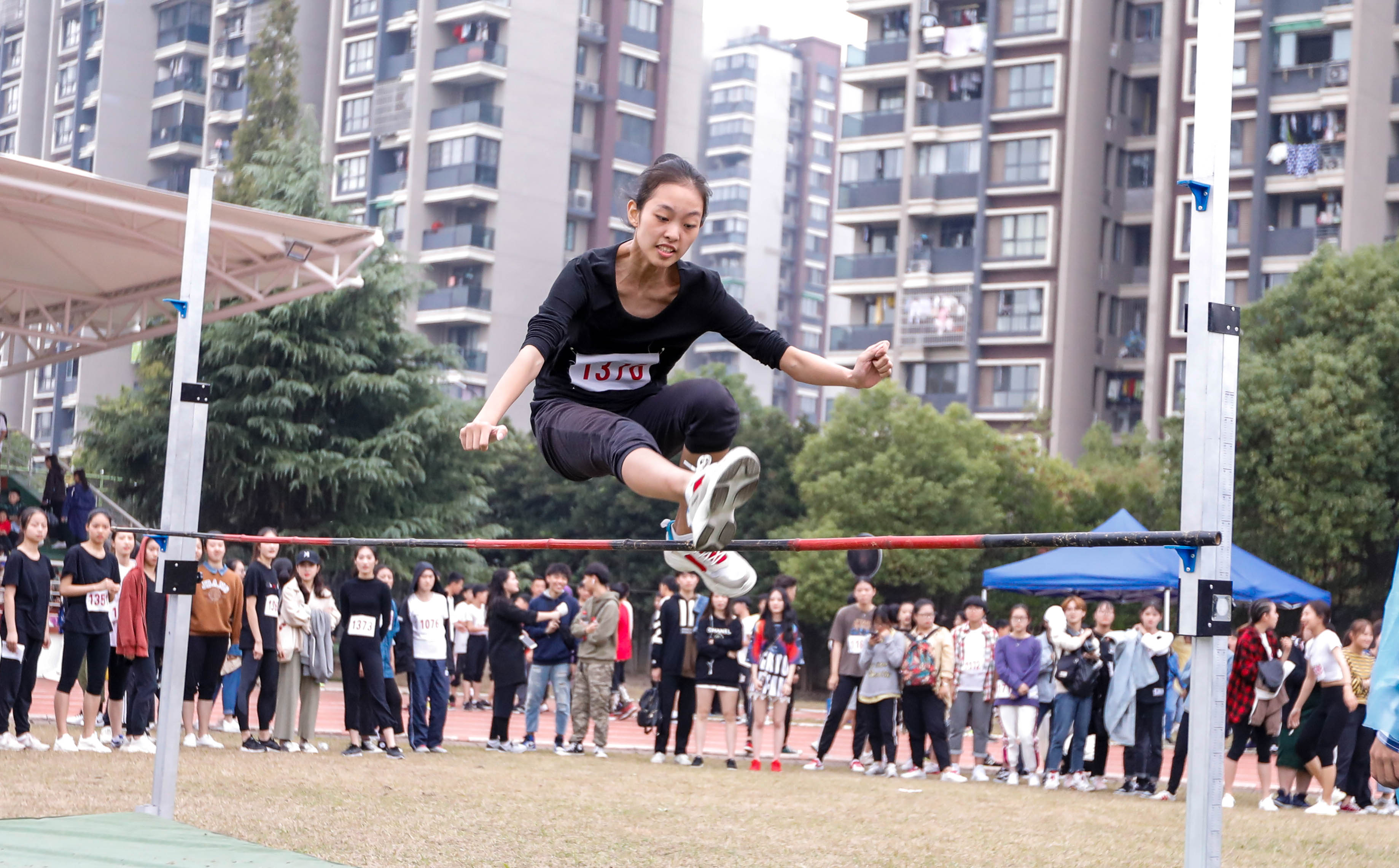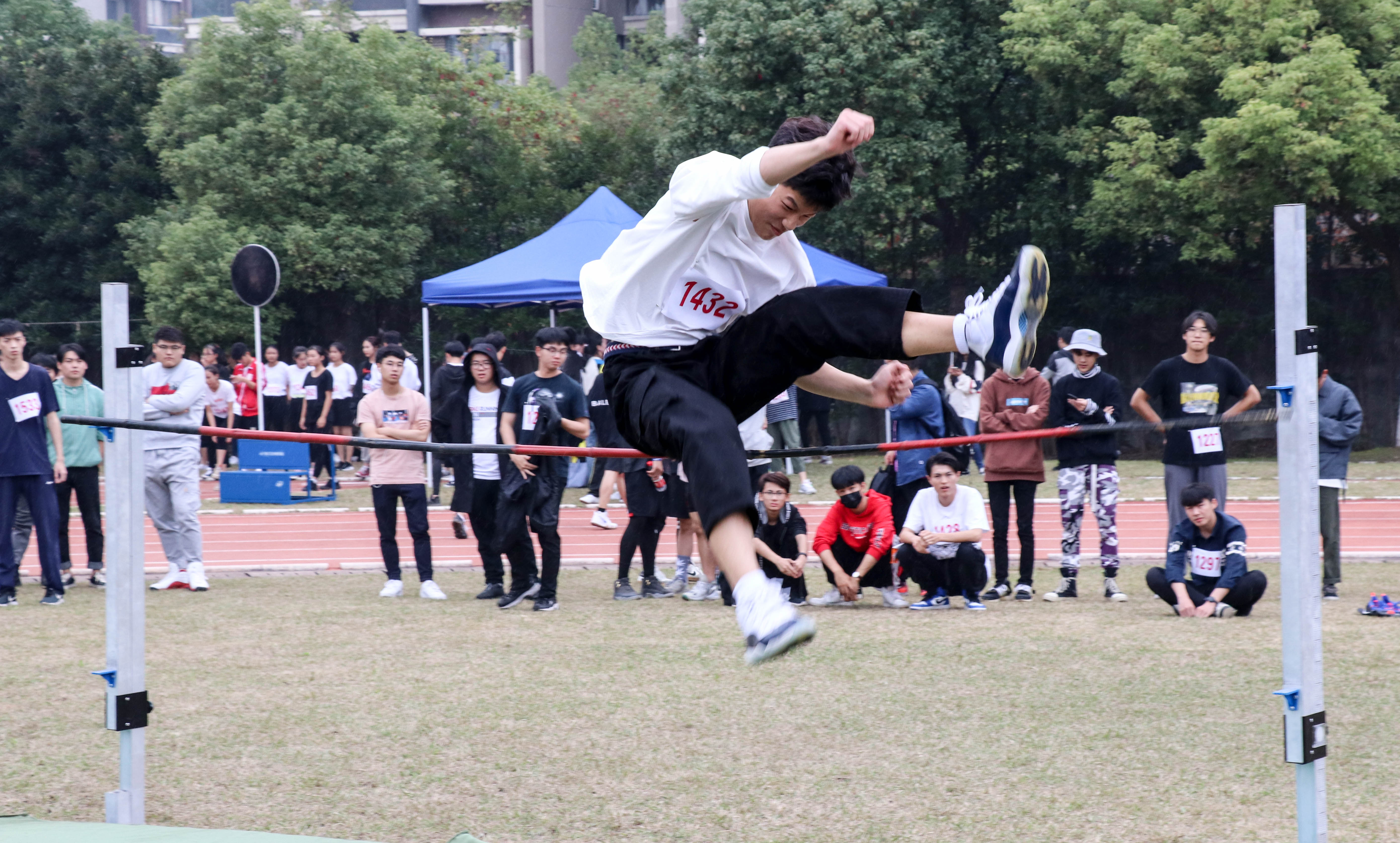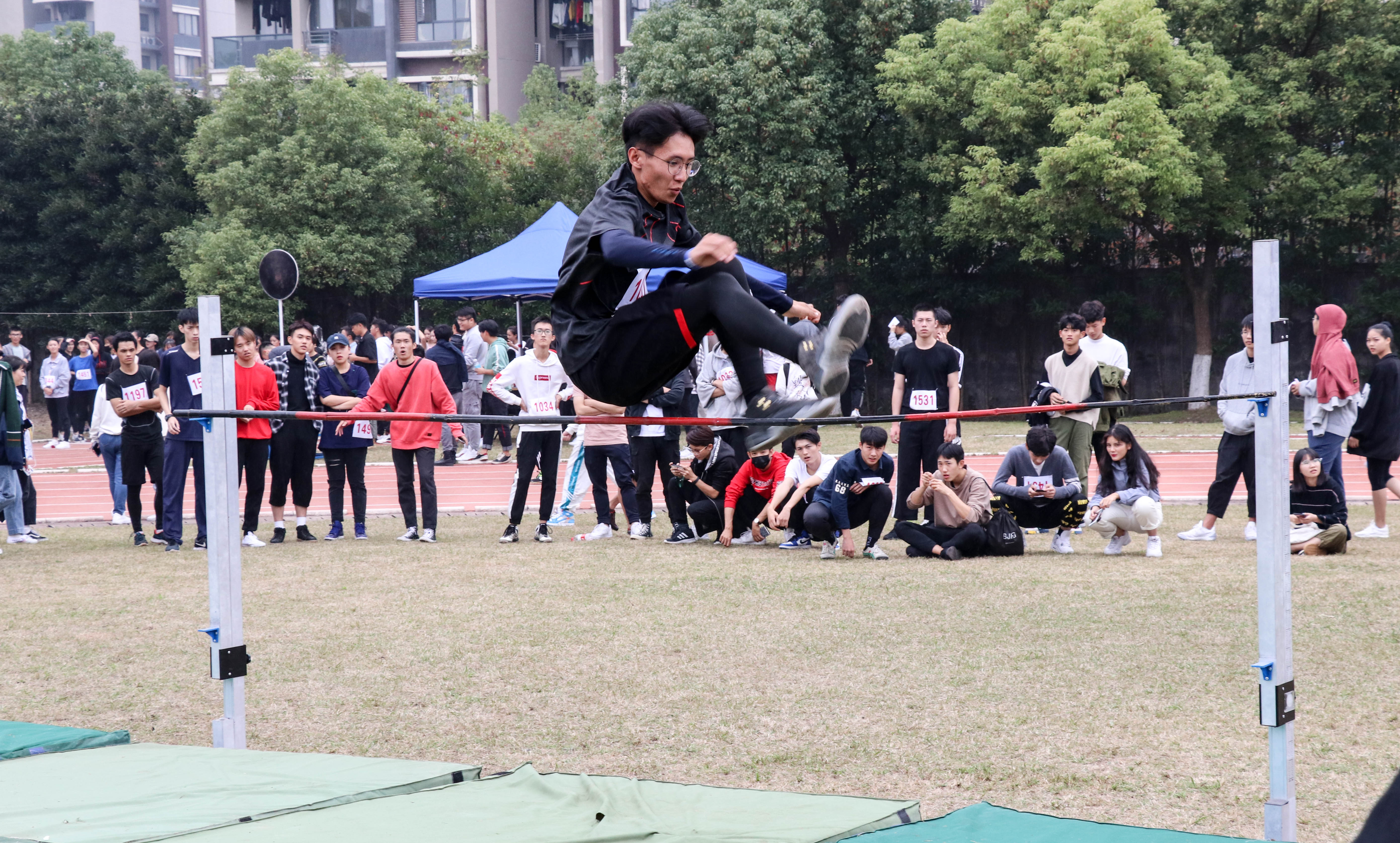 跳高场地也是分外热闹,冲刺!加速!起跳!只见一个个身影飞跃了竹竿,如同展翅飞翔的雄鹰一般。大家实力不相上下,竹竿也缓缓上升,让人觉得可望而不可及。