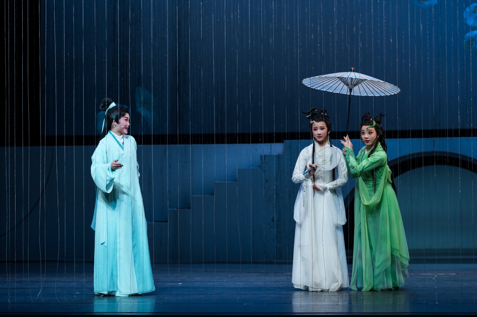 莲池生烟,如诗如画,一艘小舟从莲叶之间划过,鱼戏莲叶间,每一场景都好似古代画舫中精心挑选的画面。《断桥》在舞台设计方面花了不少心思,让经典迸发出艺术力量,用特别的灯光艺术给越剧渲染上一层独特的国风美学。在白素贞水漫金山救出困在山上的许仙时,戏曲水袖击打山石海浪的虚拟性与扑面而来的惊涛骇浪的真实感交融,加上突破传统的扩声技术,用最感性的方式传达表象背后的意义,用创新的技术手段传递戏曲背后的意蕴,使观众身临其境。通过白素贞水袖的拍打,翻滚的浪花层层叠叠席卷而起,仿佛置身于海浪中,宏伟壮观的同时增添了几分东方神韵。采用将水浪具体化,闪烁的灯光与白素珍的打斗动作相结合,以柔克刚,最后在瀑布般降下的洪啸中被压在水下,白素贞的爱恨嗔痴被这冰冷的湖水所吞没和冲刷,走向寂静,趋于无声。这一画面生动形象地展现出戏曲表演的美感与特性,又展现出古典与现代技术相融合的魅力。