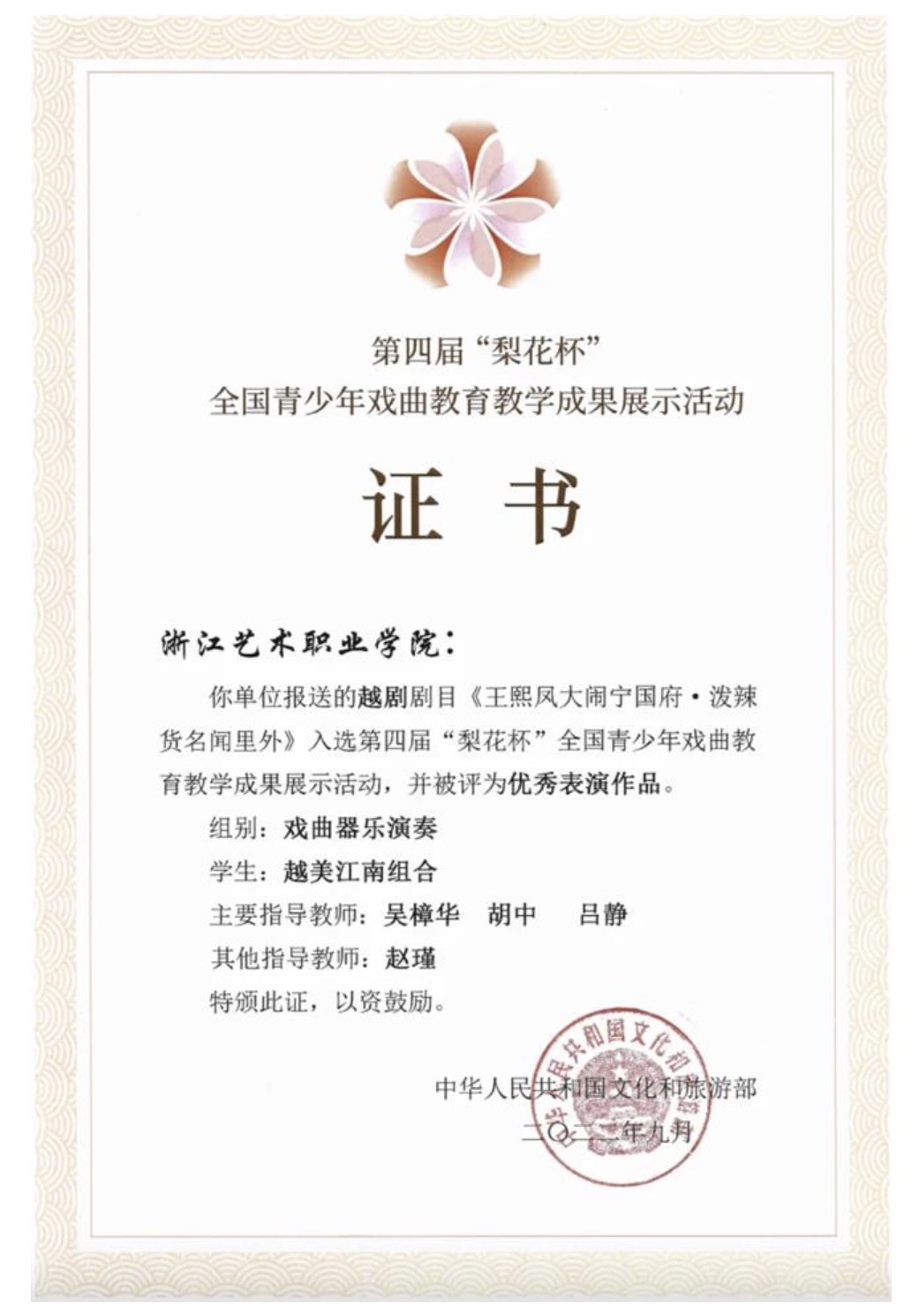 ▲戏曲器乐演奏“越美江南组合”获第四届“梨花杯”全国青少年戏曲教育教学成果展示活动优秀表演作品
