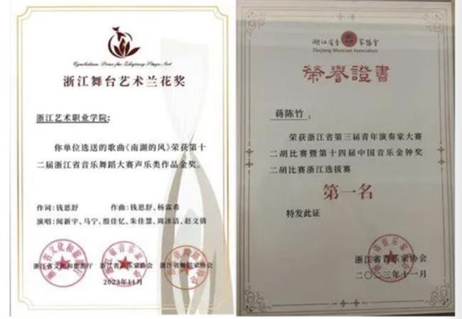 荣获国家级奖14项、省部级奖109项。摘得“浙江音乐奖”,“江南丝竹音乐演奏团”入选文旅部全国民族器乐展演最高奖,《听见江南》入选全国文化艺术职业院校对外交流与合作成果展示优秀项目。在全国青少年民族器乐教育教学成果展示、戏曲教育教学成果展演、全国职业院校技能大赛中连获最高奖。